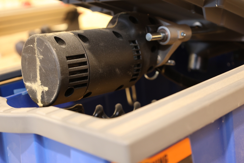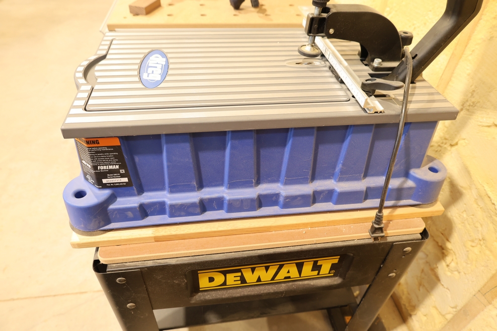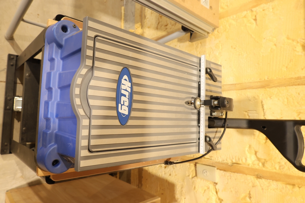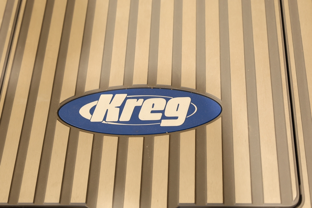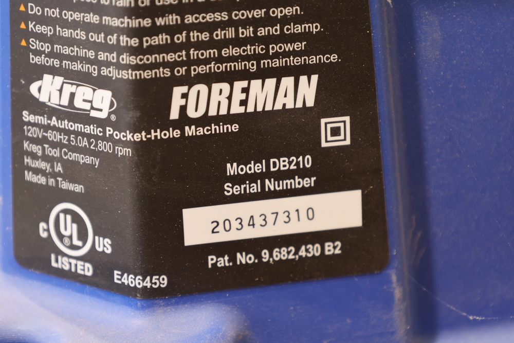 Kreg Foreman semi-automatic pocket-hole machine, model DB210, serial number 203437310, 120V electric unit mounted on a DeWalt rolling stand. Features an aluminum work surface with adjustable fence and clamping assembly as shown. Buyer is responsible for removal to the first disconnect. Excludes dust collection ductwork. No equipment is onsite to assit loading. Bring the proper tools, equipment, and help needed to load your items.