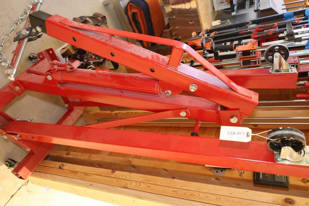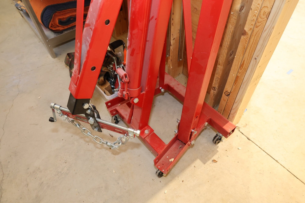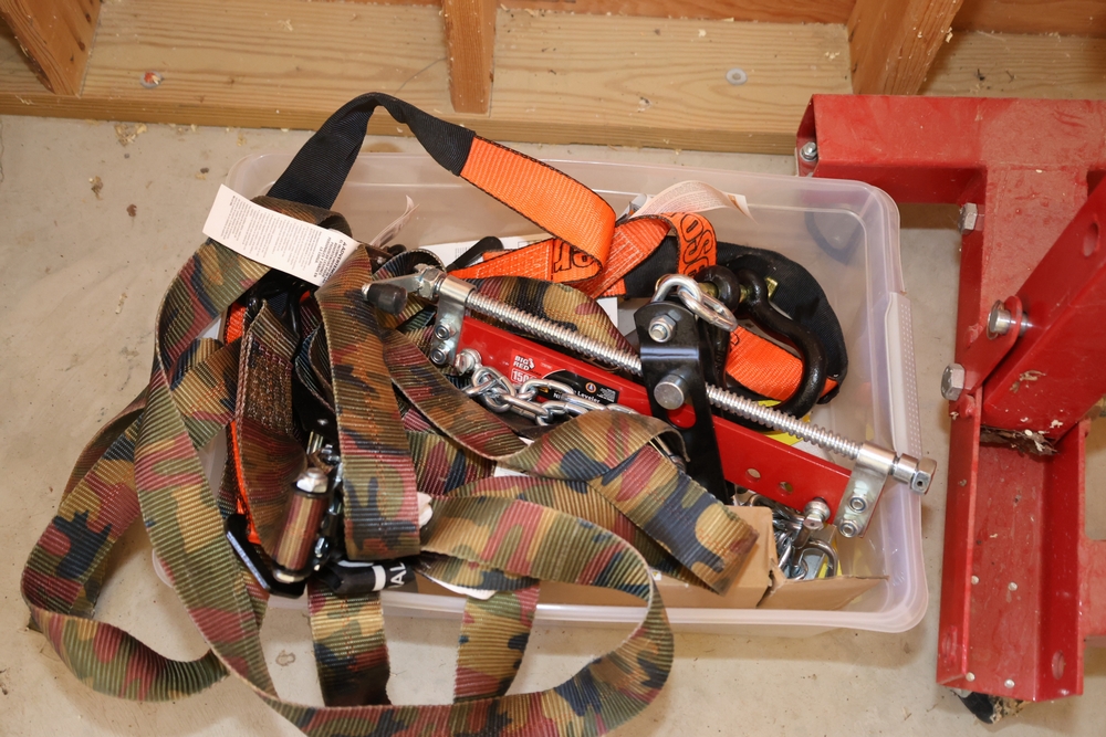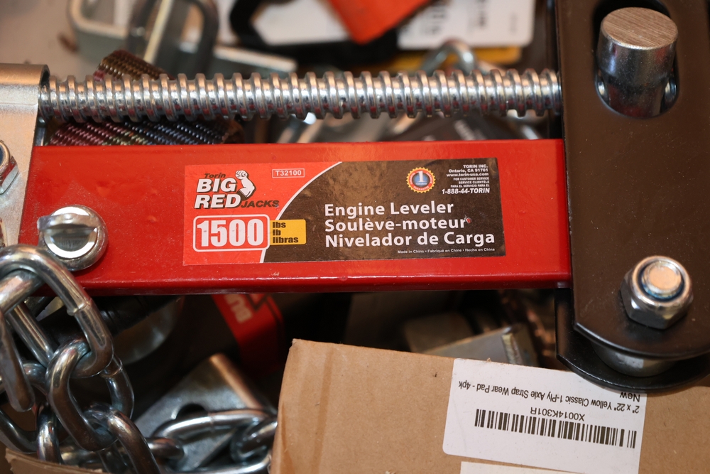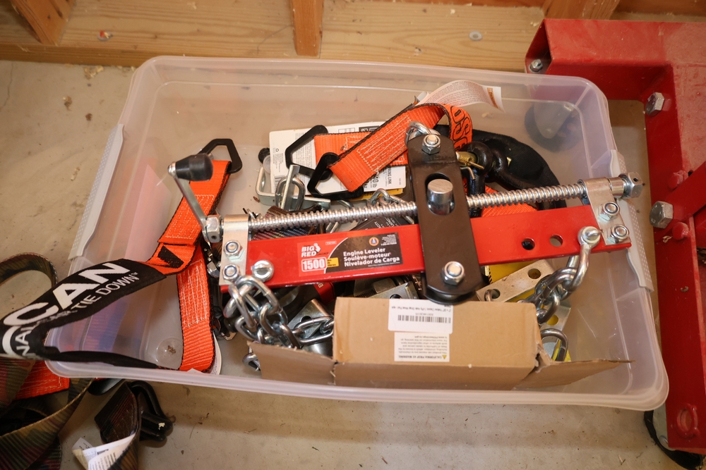 A Torin Big Red 2-ton hydraulic engine crane with foldable steel frame and boom marked for 1/2-ton, 1-ton, 1-1/2-ton, and 2-ton lift positions, paired with a Torin Big Red 1,500-lb engine leveler. The lot also includes a plastic tote containing assorted load-handling and towing accessories such as ratchet tie-down straps, cam buckle straps, chains, shackles, hitch balls, hitch pins, couplers, and related hardware. No equipment is onsite to assit loading. Bring the proper tools, equipment, and help needed to load your items.