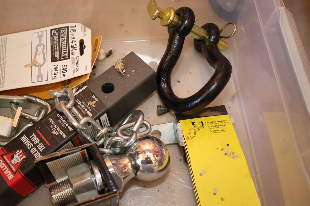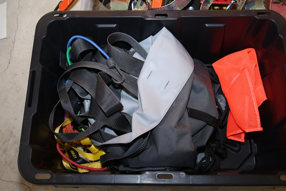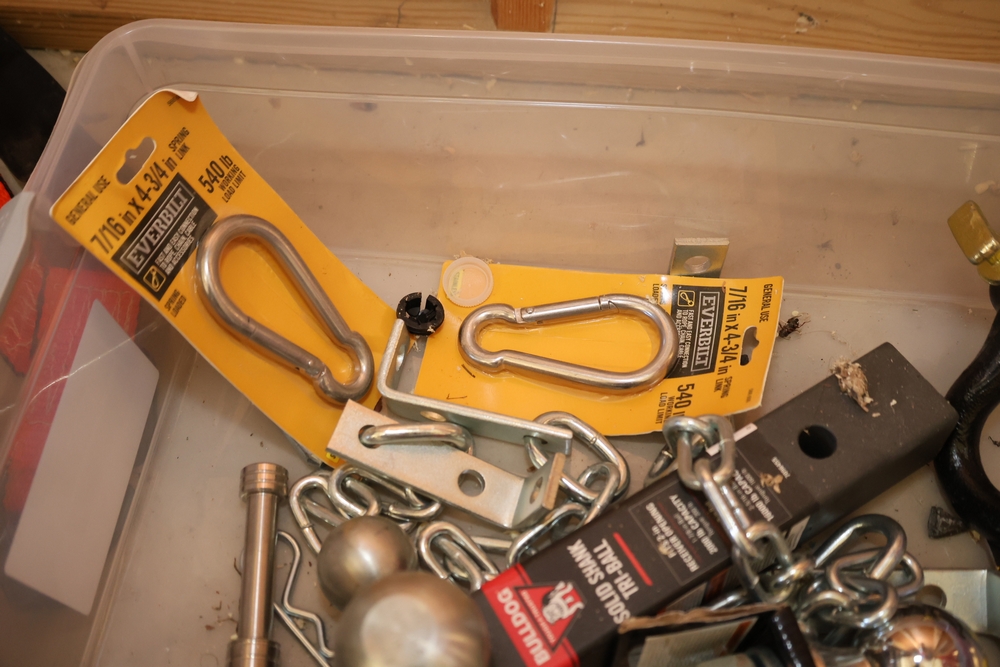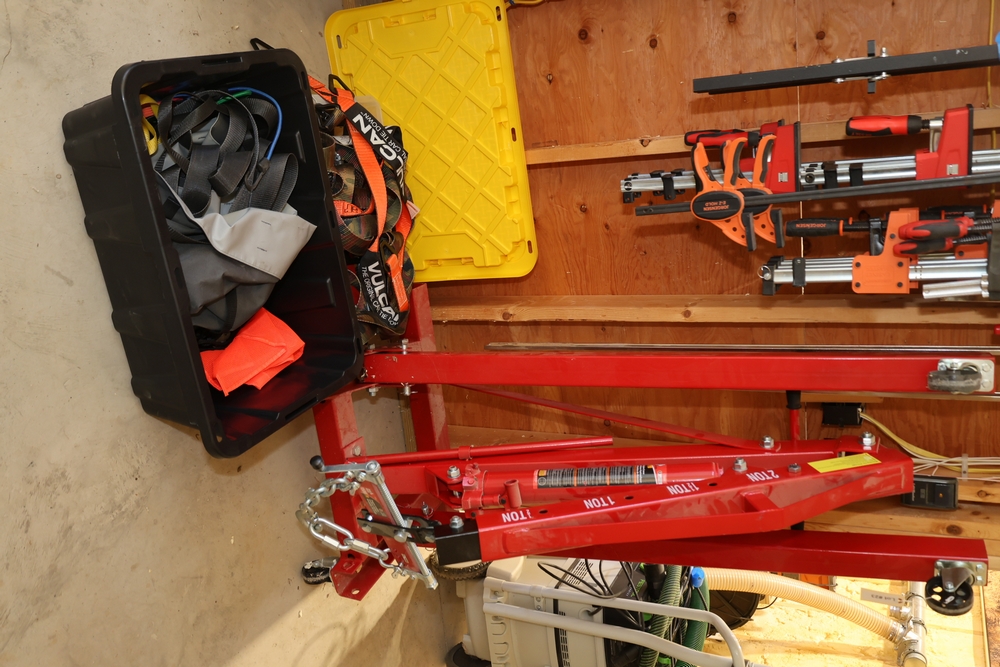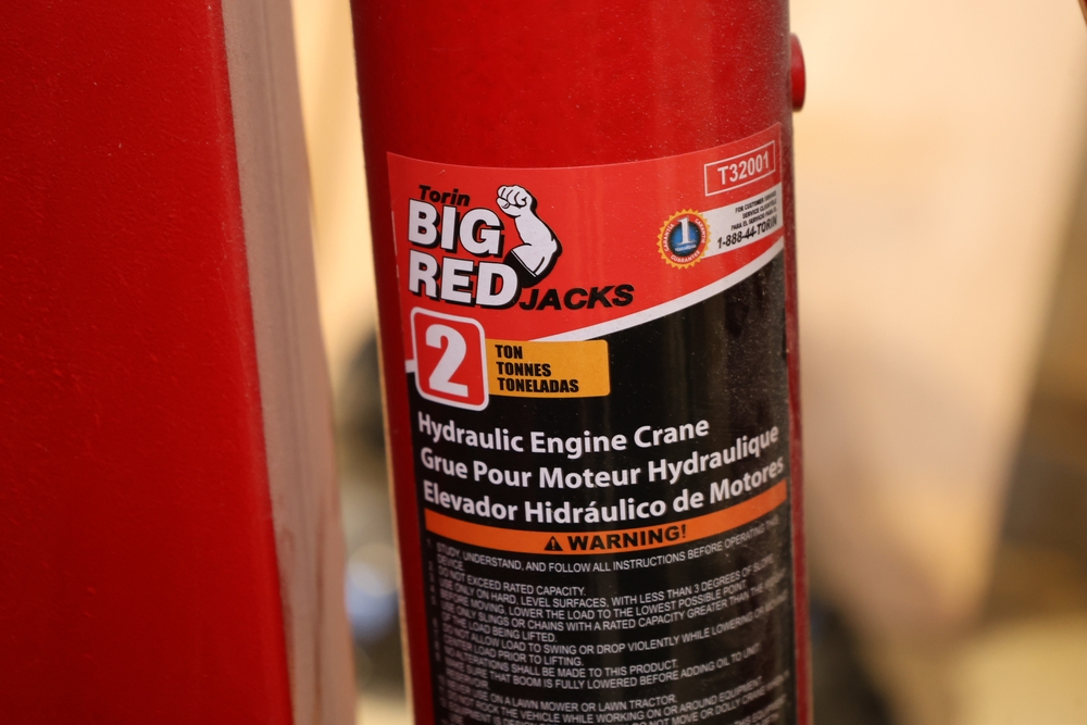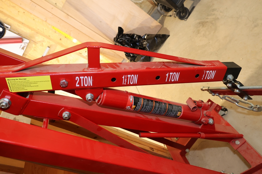 A Torin Big Red 2-ton hydraulic engine crane with foldable steel frame and boom marked for 1/2-ton, 1-ton, 1-1/2-ton, and 2-ton lift positions, paired with a Torin Big Red 1,500-lb engine leveler. The lot also includes a plastic tote containing assorted load-handling and towing accessories such as ratchet tie-down straps, cam buckle straps, chains, shackles, hitch balls, hitch pins, couplers, and related hardware. No equipment is onsite to assit loading. Bring the proper tools, equipment, and help needed to load your items.