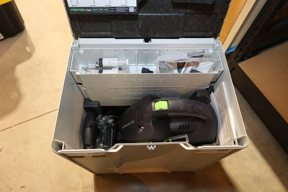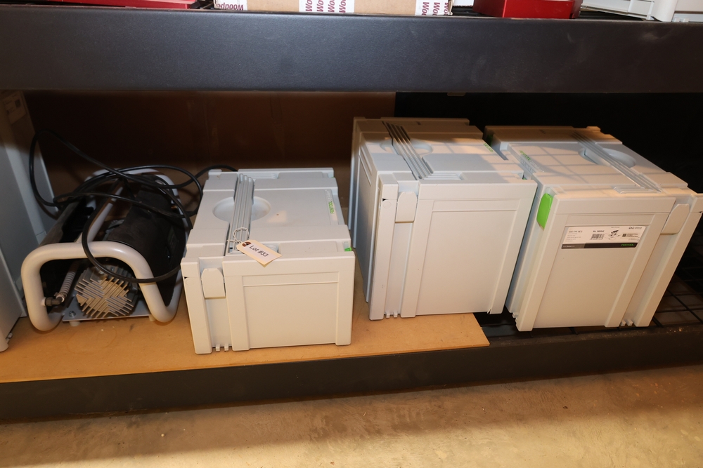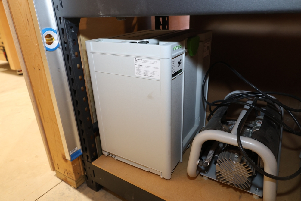 Festool vacuum system and joinery package including a Festool Domino XL DF 700 EQ-Set US joining machine, 720W, No. 576431, in Systainer; Festool VAC SYS SE 2 vacuum unit, No. 580062; Festool VAC-PMP vacuum pump; Festool VAC SYS SE 1 vacuum unit, No. 201065; and Festool VAC SYS VT Sort accessory Systainer, No. 495294, with associated hoses and components housed in Festool Systainers. No equipment is onsite to assit loading. Bring the proper tools, equipment, and help needed to load your items.