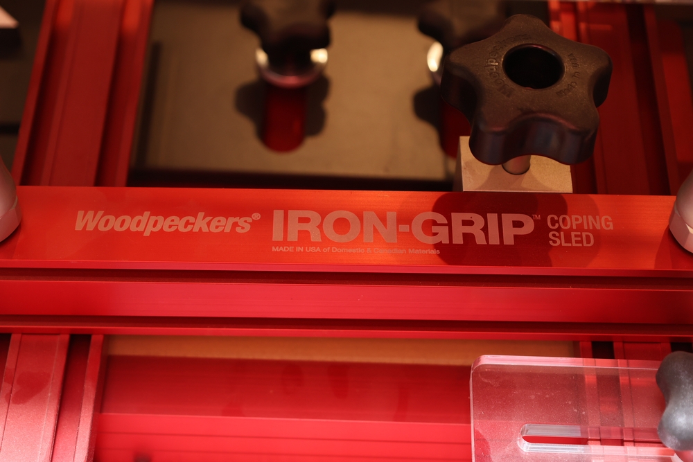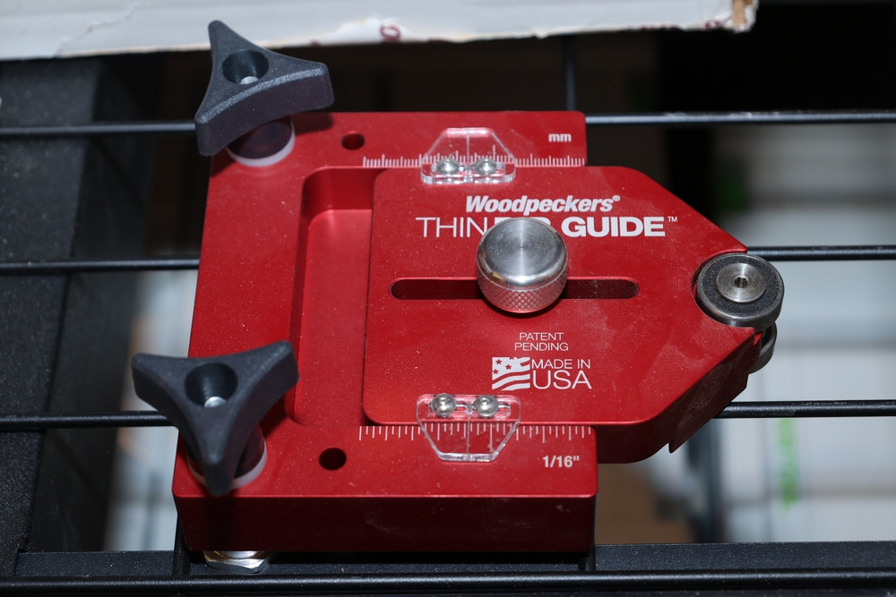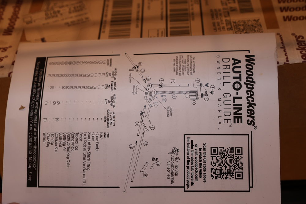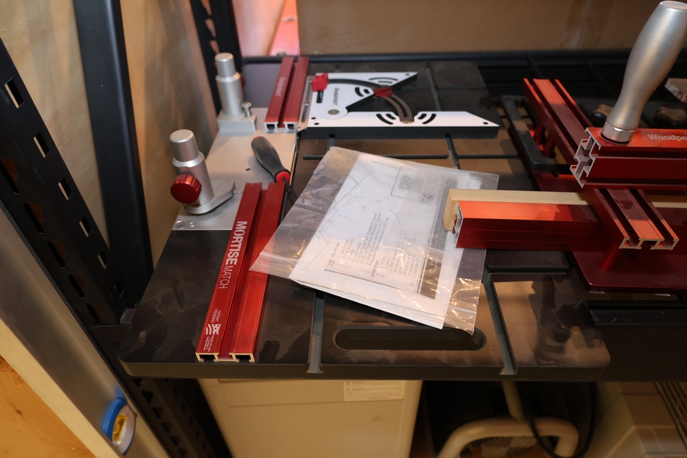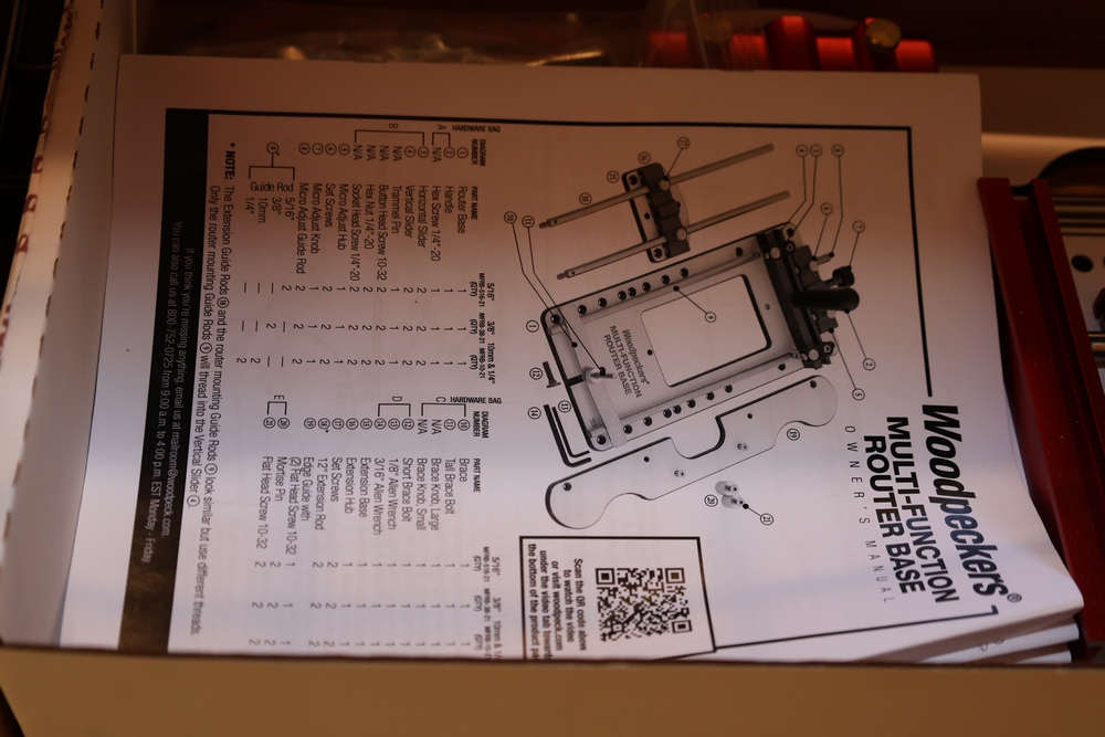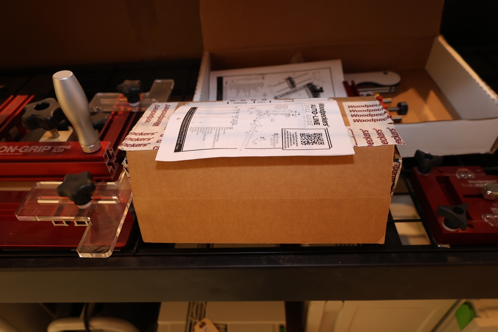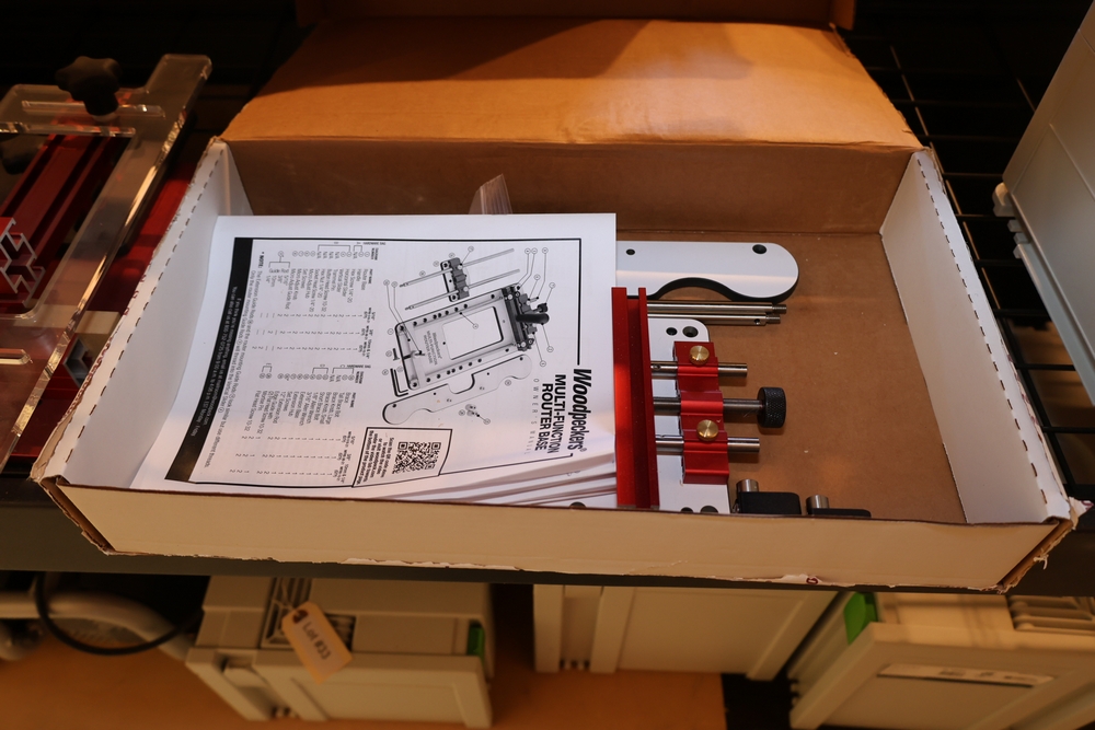 Woodpeckers woodworking tool lot including a Woodpeckers Multi-Function Router Base with original box and manual, Woodpeckers Iron-Grip Coping Sled, Woodpeckers MortiseMatch, Woodpeckers ThinRip Guide, and Woodpeckers Auto-Line Drill Guide with manual, featuring anodized aluminum construction and adjustable components. No equipment is onsite to assit loading. Bring the proper tools, equipment, and help needed to load your items.