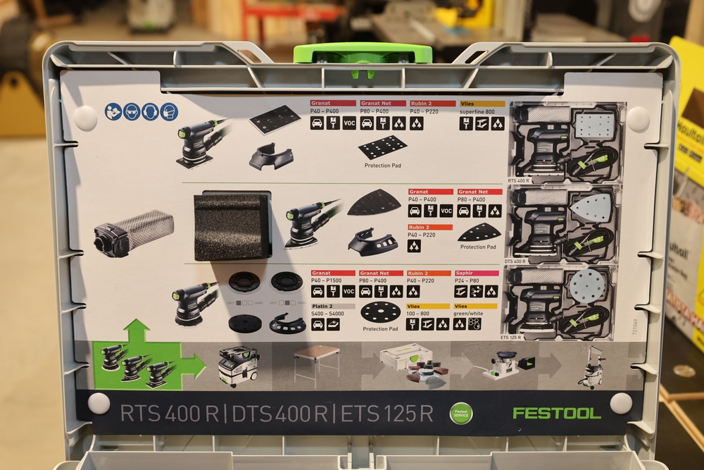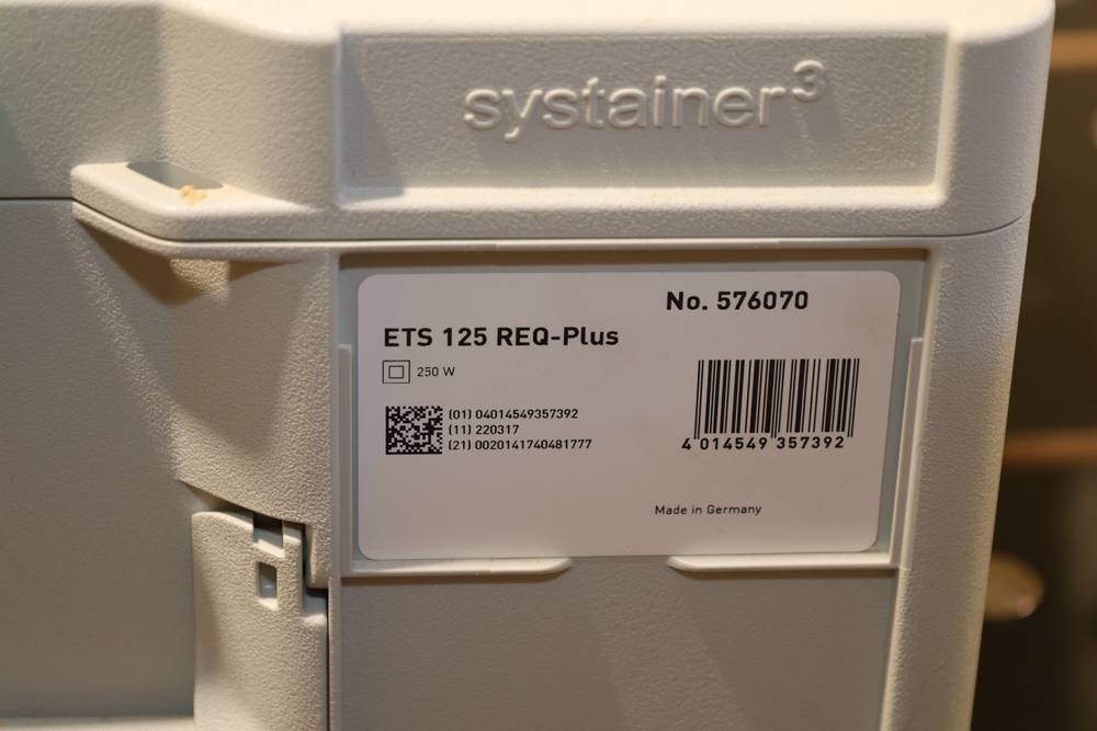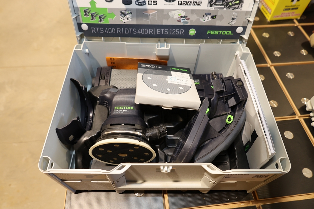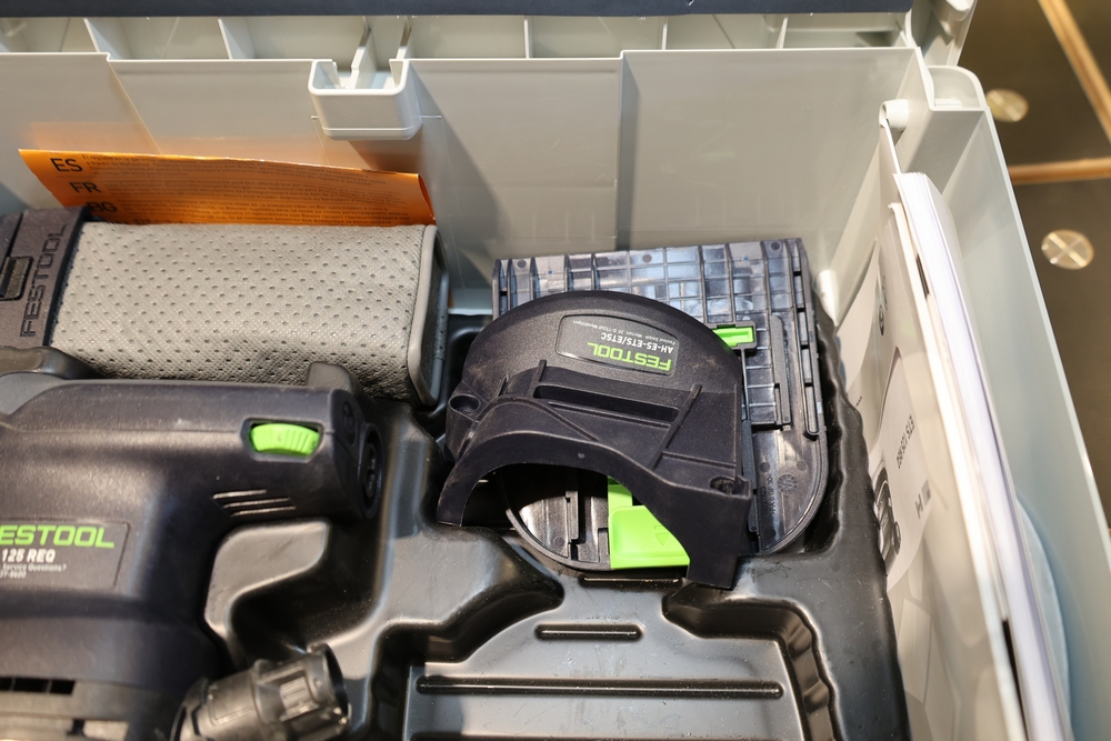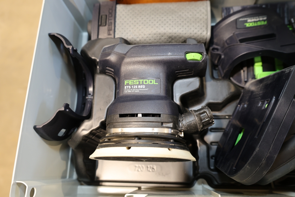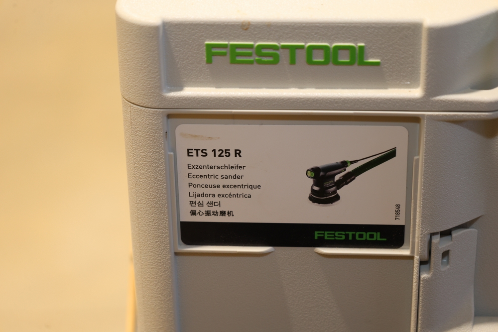 Festool ETS 125 REQ-Plus 5" random orbit sander, 250W, model no. 576070, housed in a Festool Systainer case and including the sander unit, detachable dust collection bag, edge protector, sanding pad, power cord, and assorted documentation and accessories contained within the case. No equipment is onsite to assit loading. Bring the proper tools, equipment, and help needed to load your items.