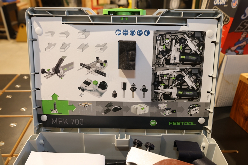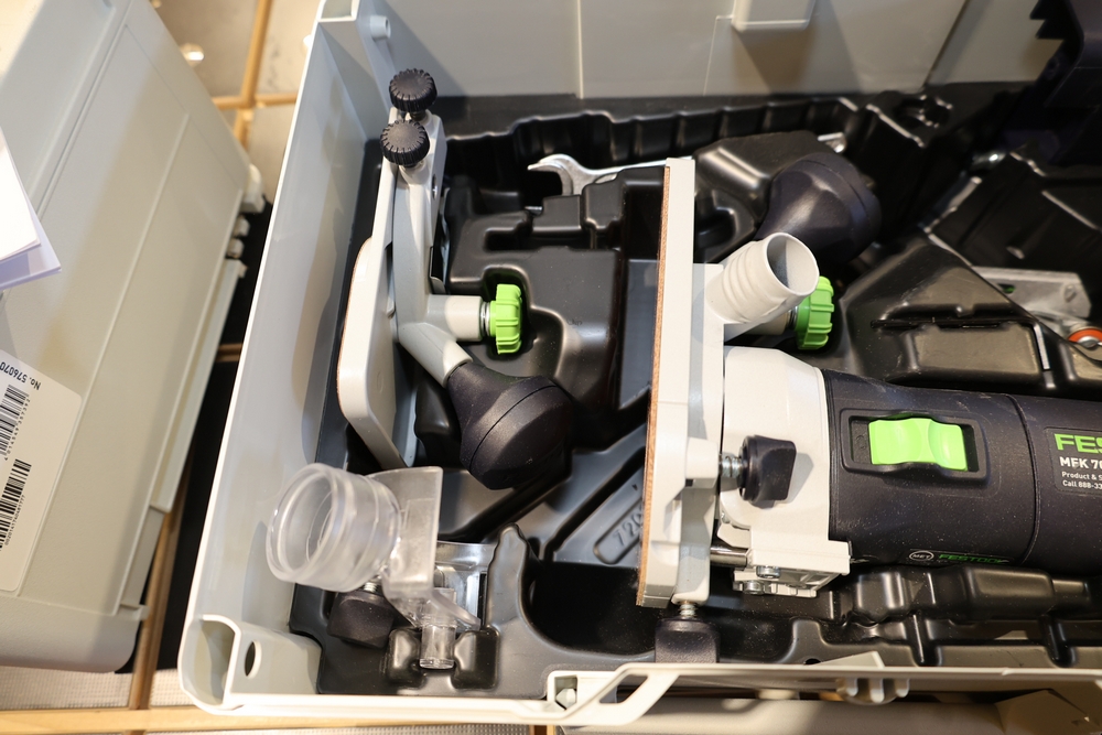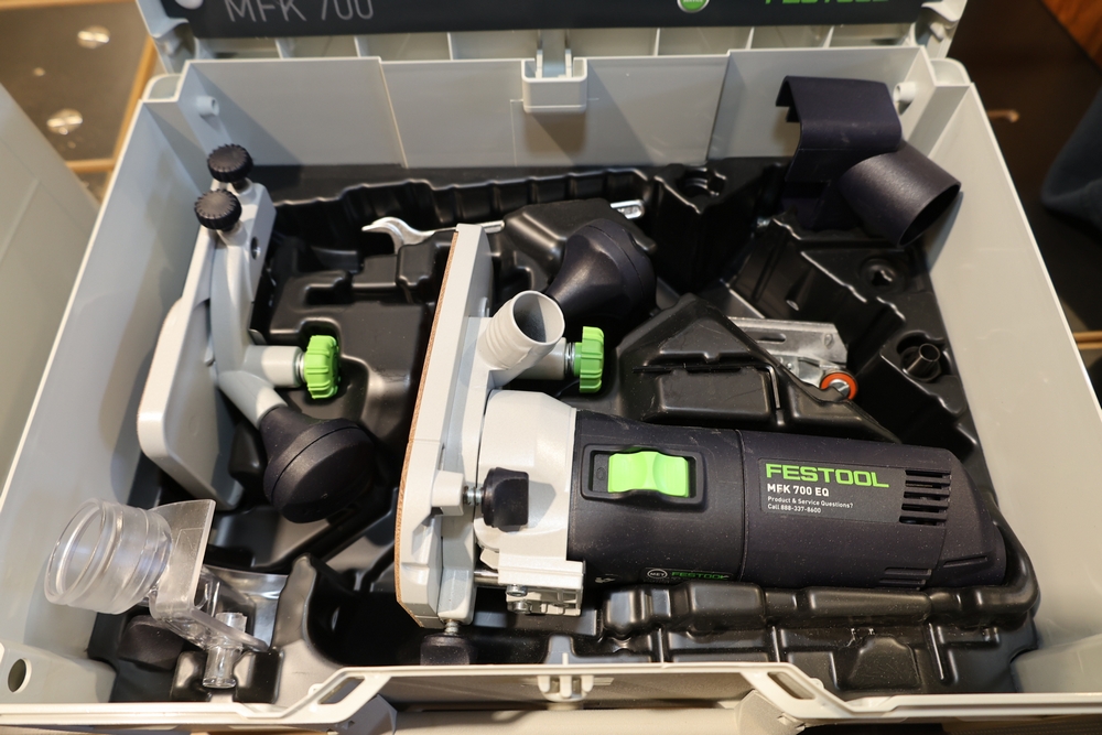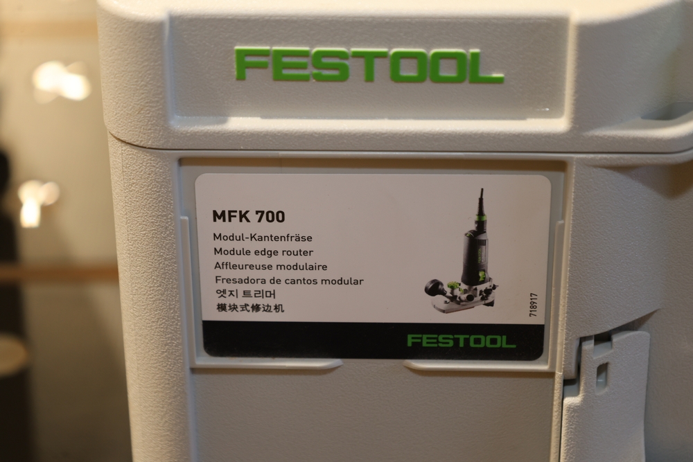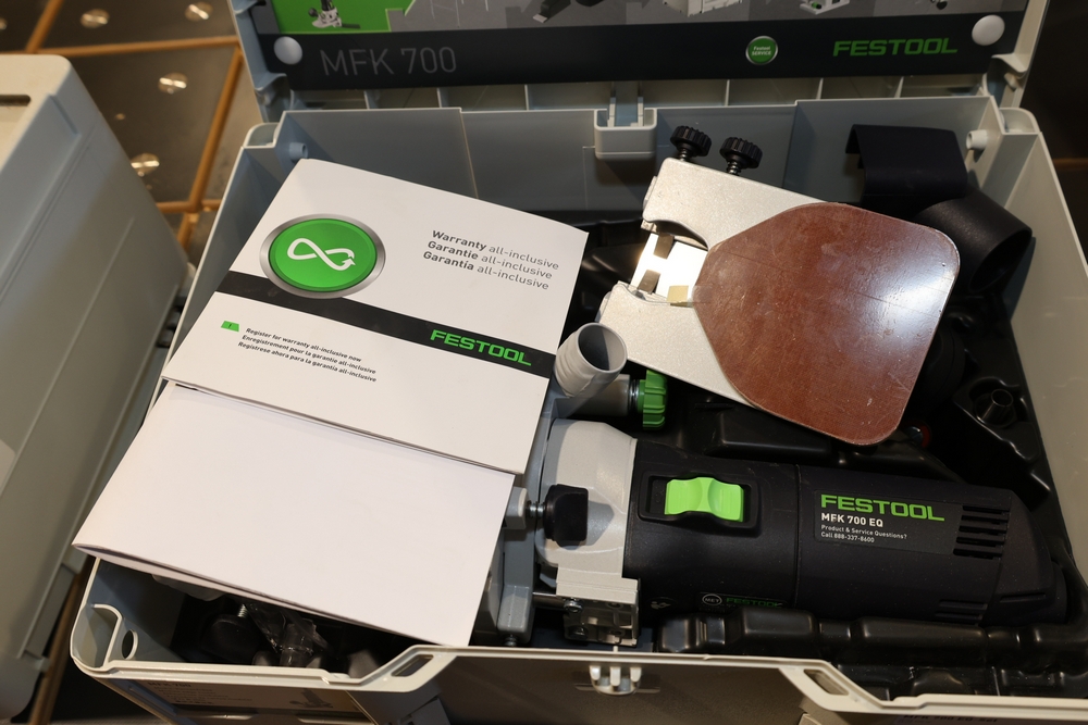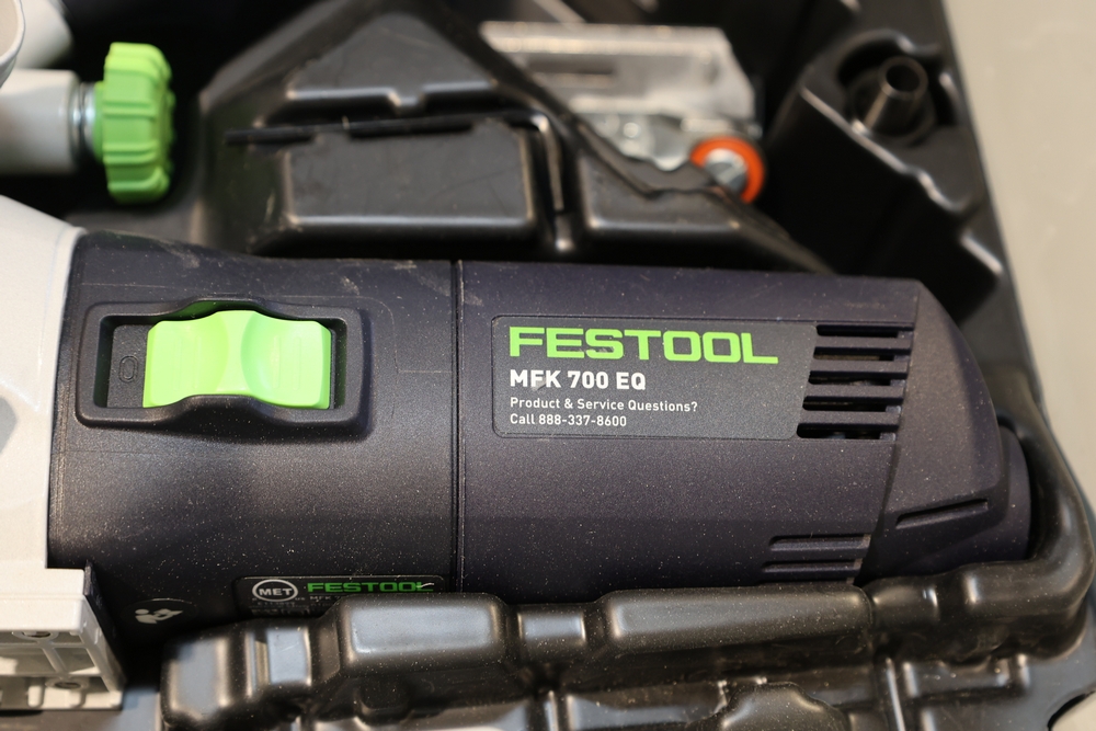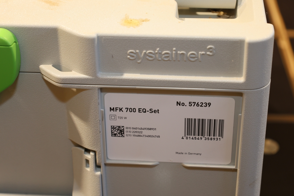 Festool MFK 700 EQ-Set modular edge router, 720W, model number 576239, housed in a Festool Systainer storage case, including interchangeable routing bases and attachments as pictured, along with manuals and accessories contained within the case. No equipment is onsite to assit loading. Bring the proper tools, equipment, and help needed to load your items.