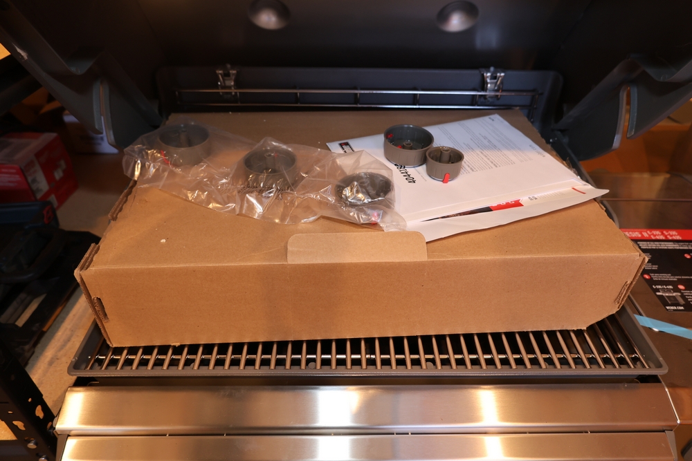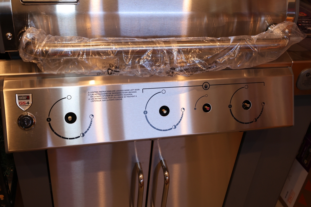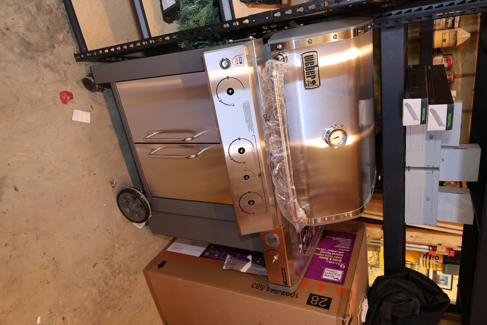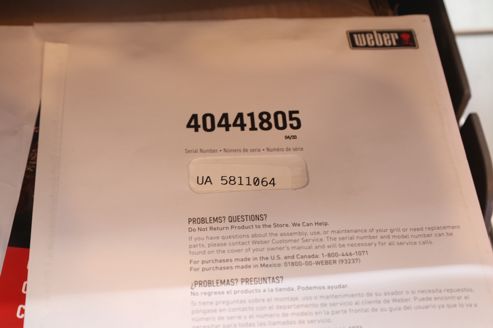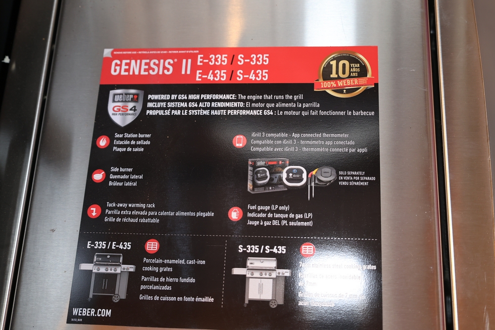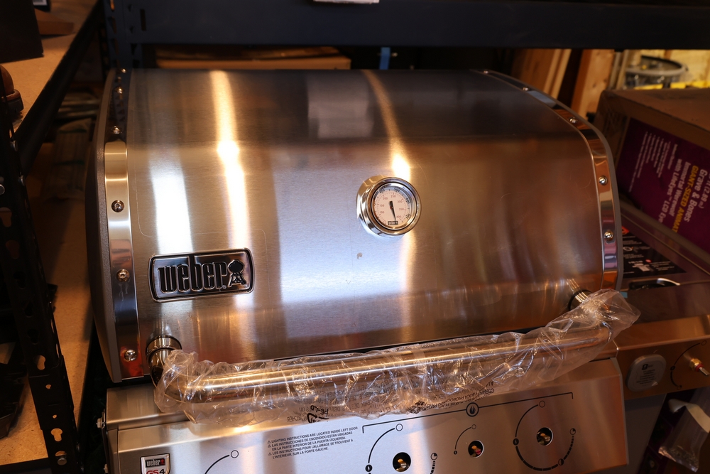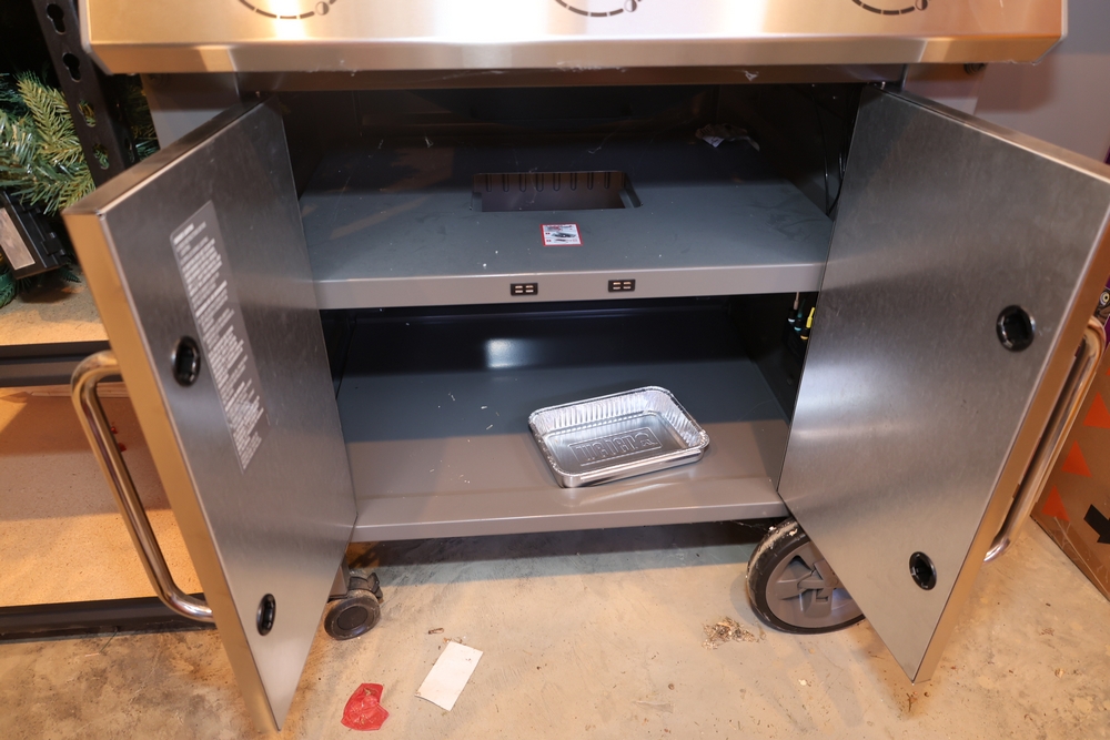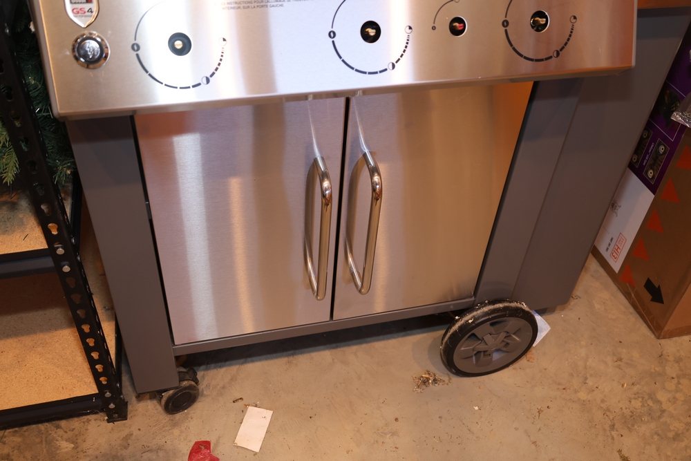 Weber Genesis II gas grill, model S-335, stainless steel construction, natural gas configuration, serial number UA 5811064, mounted on cart with double cabinet doors, side burner, control knobs, built-in thermometer, and lower storage shelf, includes Weber grill cover, owner’s manual packet, and additional boxed components and hardware. No equipment is onsite to assit loading. Bring the proper tools, equipment, and help needed to load your items.