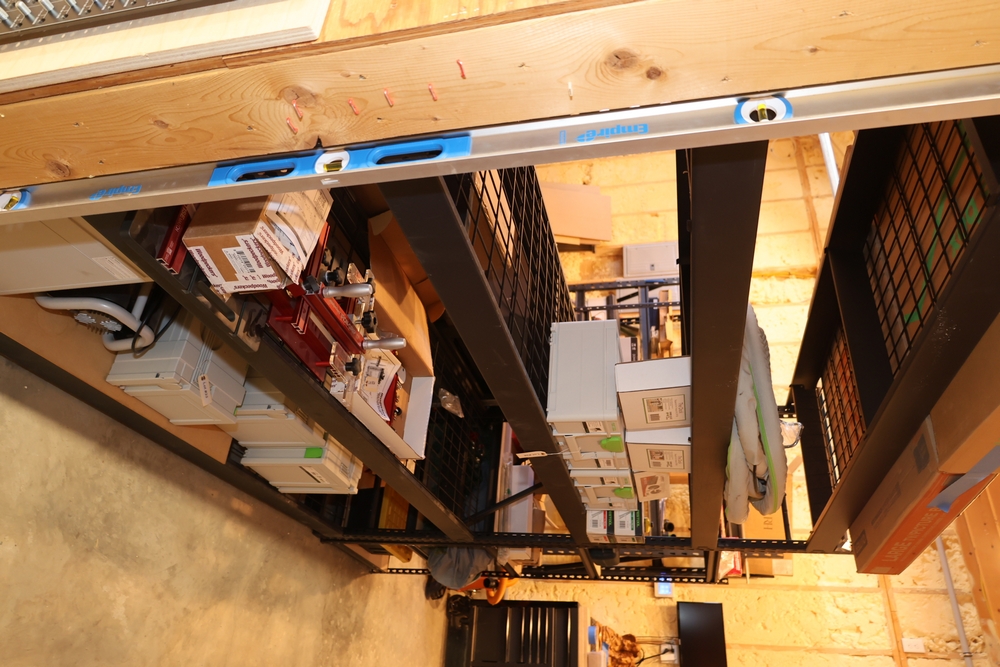 Lot of five black metal storage shelving units, includes two different styles, larger units measure approximately 8 feet long by 24 inches deep, smaller units measure approximately 48 inches wide, shelving units only, contents not included No equipment is onsite to assit loading. Bring the proper tools, equipment, and help needed to load your items.
