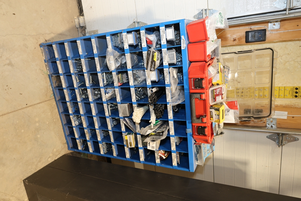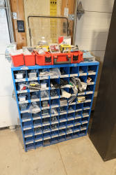 Fastenal blue metal wall-mounted hardware organizer with multiple labeled compartments containing assorted bolts, hex nuts, flat washers, split lock washers, nylon insert lock nuts, and miscellaneous fasteners in various sizes, along with red plastic organizer bins and assorted packaged screws, anchors, and small hardware items stored within the unit. No equipment is onsite to assit loading. Bring the proper tools, equipment, and help needed to load your items.