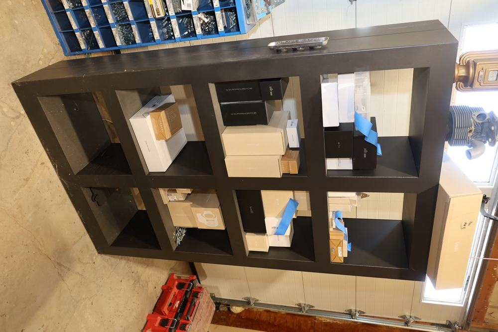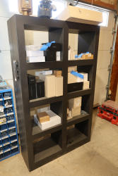 Black metal 8-cube shelving unit measuring approximately 48 inches wide, 16 inches deep, and 72 inches high. Features a rectangular frame with eight open storage compartments in a two-by-four configuration and a flat top surface. Freestanding design suitable for shop, garage, office, or retail display use. Contents not included. No equipment is onsite to assit loading. Bring the proper tools, equipment, and help needed to load your items.