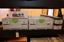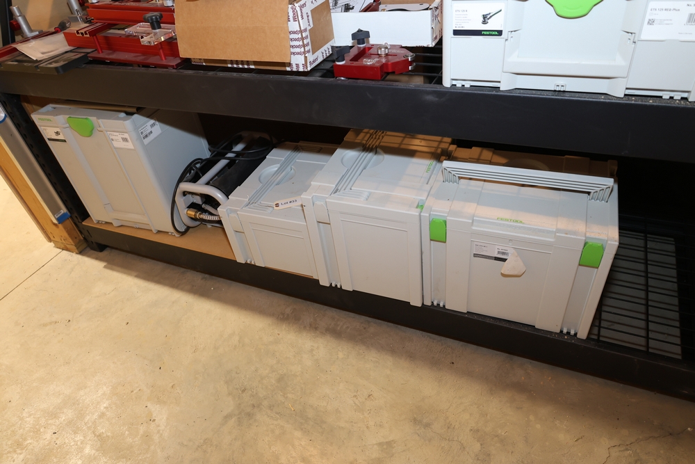 Festool vacuum system and joinery package including a Festool Domino XL DF 700 EQ-Set US joining machine, 720W, No. 576431, in Systainer; Festool VAC SYS SE 2 vacuum unit, No. 580062; Festool VAC-PMP vacuum pump; Festool VAC SYS SE 1 vacuum unit, No. 201065; and Festool VAC SYS VT Sort accessory Systainer, No. 495294, with associated hoses and components housed in Festool Systainers. No equipment is onsite to assit loading. Bring the proper tools, equipment, and help needed to load your items.