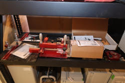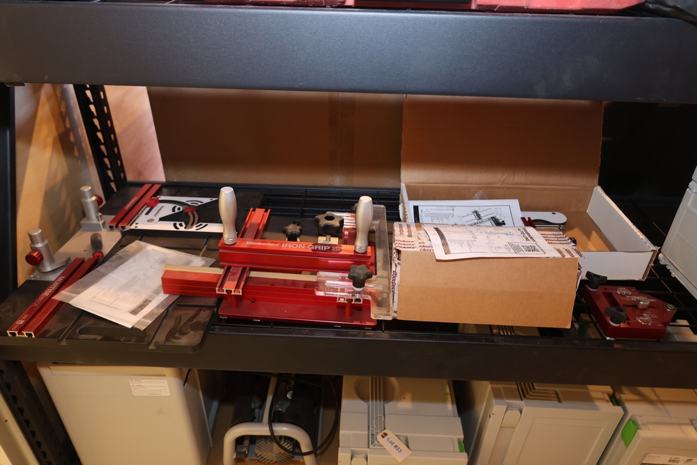Woodpeckers woodworking tool lot including a Woodpeckers Multi-Function Router Base with original box and manual, Woodpeckers Iron-Grip Coping Sled, Woodpeckers MortiseMatch, Woodpeckers ThinRip Guide, and Woodpeckers Auto-Line Drill Guide with manual, featuring anodized aluminum construction and adjustable components. No equipment is onsite to assit loading. Bring the proper tools, equipment, and help needed to load your items.