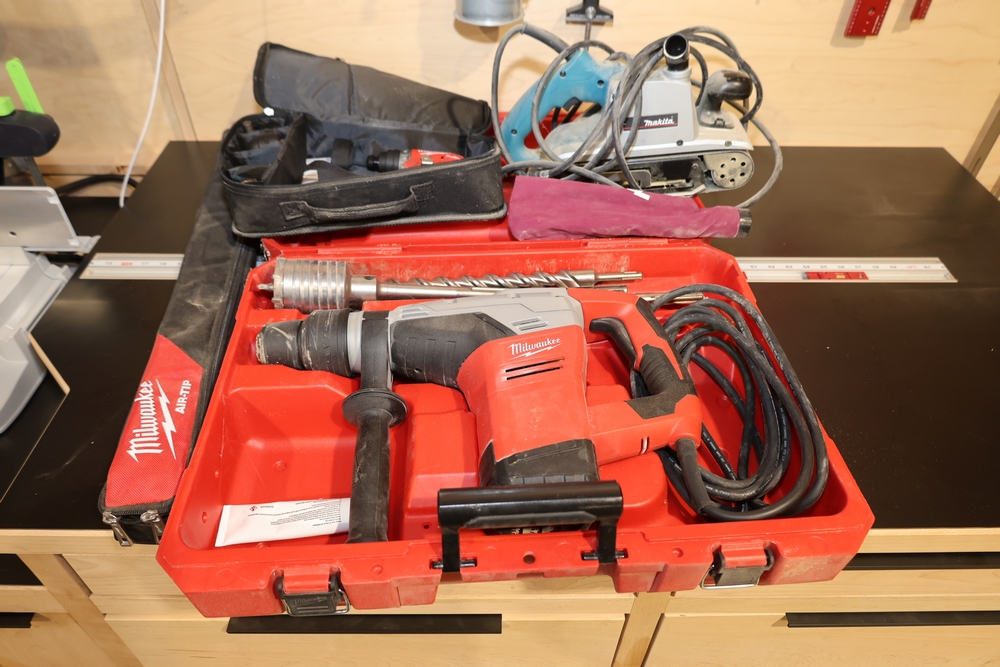Milwaukee 1-9/16 in. SDS-Max rotary hammer, Cat. No. 5317-20, 120V, 10.5A, 0–300 RPM, 3,000 BPM, in hard case with side handle, assorted SDS-Max drill bits and core bit; Milwaukee M12 FUEL 3/8 in. installation drill/driver, Cat. No. 2505-20; Makita 4 in. x 24 in. belt sander, Model 9403, 120V, 11A, 60Hz; and Milwaukee AIR-TIP accessory in zippered case. No equipment is onsite to assit loading. Bring the proper tools, equipment, and help needed to load your items.