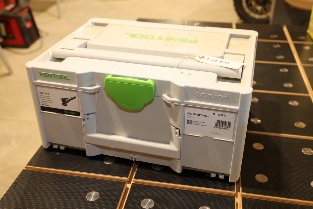 Festool ETS 125 REQ-Plus 5" random orbit sander, 250W, model no. 576070, housed in a Festool Systainer case and including the sander unit, detachable dust collection bag, edge protector, sanding pad, power cord, and assorted documentation and accessories contained within the case. No equipment is onsite to assit loading. Bring the proper tools, equipment, and help needed to load your items.