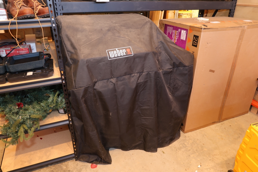 Weber Genesis II gas grill, model S-335, stainless steel construction, natural gas configuration, serial number UA 5811064, mounted on cart with double cabinet doors, side burner, control knobs, built-in thermometer, and lower storage shelf, includes Weber grill cover, owner’s manual packet, and additional boxed components and hardware. No equipment is onsite to assit loading. Bring the proper tools, equipment, and help needed to load your items.