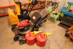 Honda HRN216VKAD walk behind lawn mower with GCV170 engine and 21 inch cutting deck, featuring Smart Drive control and Easy Start auto choke system, includes rear grass collection bag, two Eagle metal safety gas cans, one metal fuel can, and one Echo premium bar and chain oil container, all partially filled. No equipment is onsite to assit loading. Bring the proper tools, equipment, and help needed to load your items.