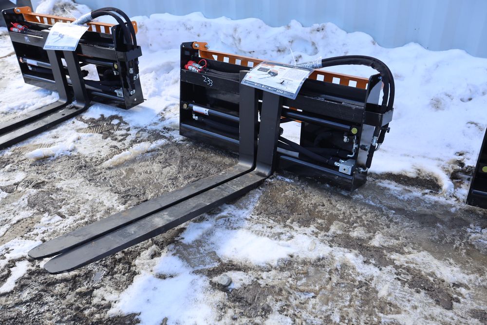 New 2026 Wolverine skid steer pallet fork attachment hydraulic adjustment, model PFA-11-3300G, 48" fork adjustment.