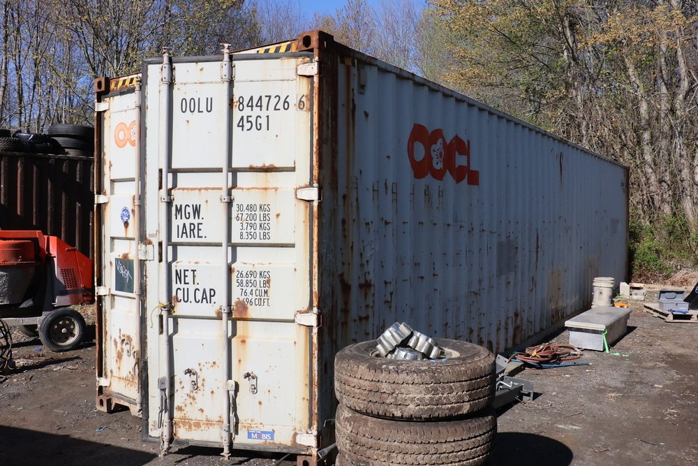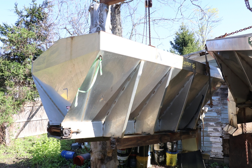 Items are a 45-foot shipping container & Downeaster six-yard stainless steel salt spreader with an electric motor. Items are located in Stormville, NY.