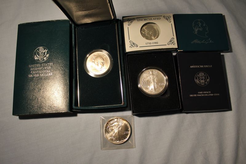 Silver U.S. coins including two Walking Liberty 1 Oz Fine Silver One Dollar coins (1989 & 2000); a 1990 Eisenhower Uncirculated Silver Dollar with case and COA; a 1982 George Washington commemorative silver half dollar. Shipping is available for this item.