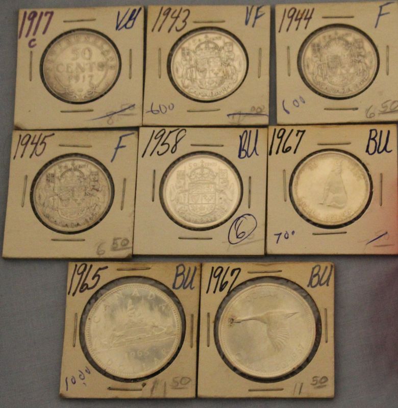 Silver Canadian coins including six 50 cent pieces (1917, 1943, 1944, 1945, 1958 & 1967) and 2 silver dollars (1965 & 1967). Shipping is available for this item.