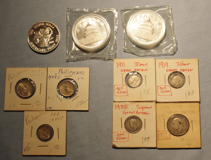 Foreign coins including a 1989 Australia Koala 1 Troy Ounce .999 Silver Dollar; a 1989 China 1 Ounce .999 Silver 10 Yuan; a 1990 China 1 Ounce .999 Silver 10 Yuan; a 1934 English silver shilling; three English 3 pence coins (1911, 1919 & 1938); a Phillippines 1944d 20 centavos coin; a Phillippines 1944d 10 centavos coin and a Phillippines 1944s 5 centavos coin.