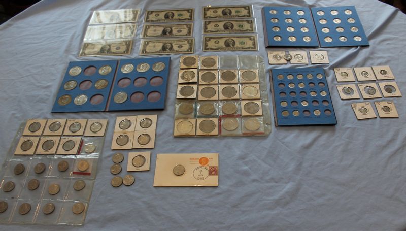 U.S. coins (all dated 1965 or later) and currency. Coins include 28 Eisenhower dollars; 30 Susan B. Anthony dollars; 28 Washington quarters; 22 Roosevelt dimes. Currency includes a 1935 G $1 Silver Certificate; a Series 1957 A $1 Silver Certificate; three Series 1957 $1 Silver Certificates; 4 Series 1976 $2 bills.