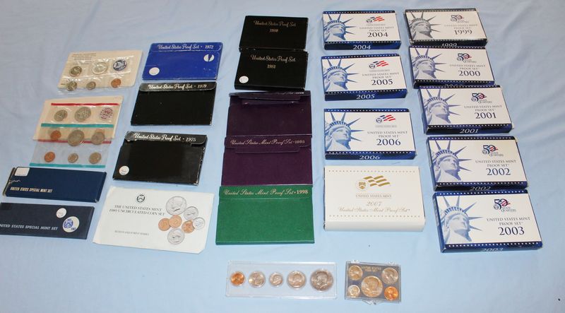 U.S. Mint coin sets including a 1965 Special Mint set; 1972 Mint Set; 1966 and 1967 Special Mint Sets; United States Proof sets from 1972, 1979, 1975, 1980, 1981, 1992, 1993, 1998, 2004, 2005, 2006, 2007; an Uncirculated Coin Set with D and P mint marks from 1989; 50 State Quarters Mint Proof Sets from 1999, 2000, 2001, 2002, 2003. Also with this lot are sets of coins from 1974 and 1980 in clear plastic containers.