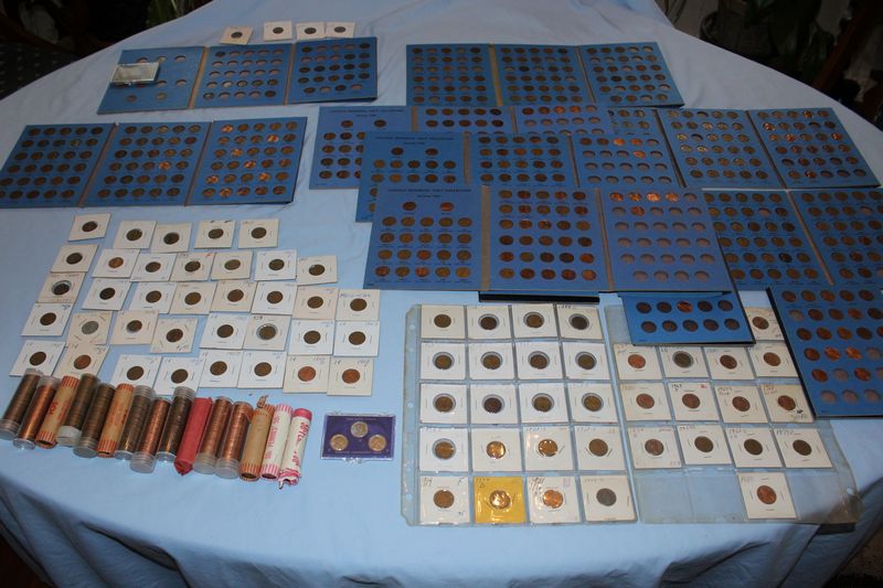 Large lot of U.S. pennies, many unsorted. Some Indian Head and Wheat. Many partial sets. 15 rolls (2 appear to be Wheat)