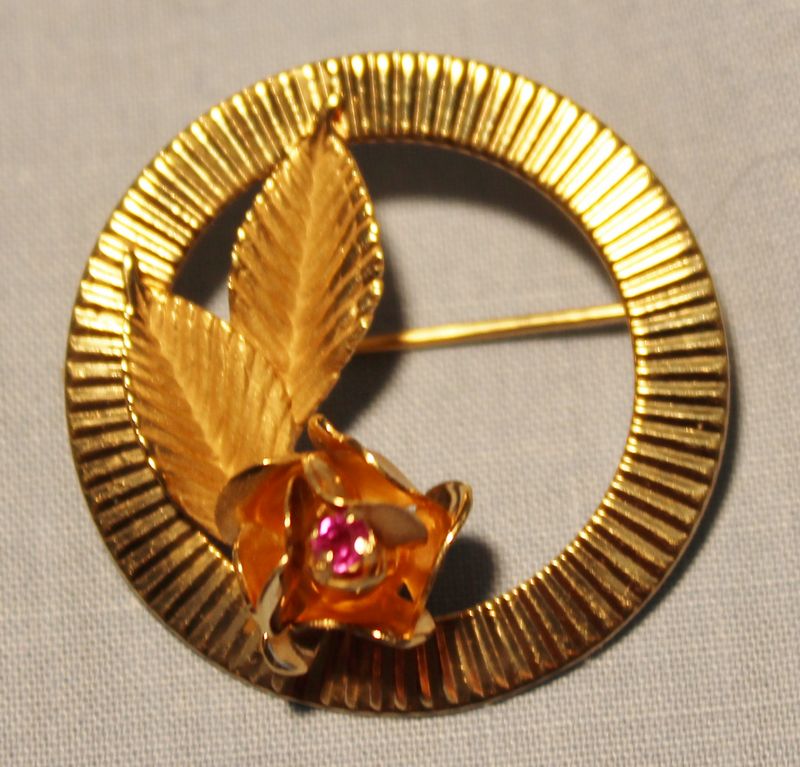 14k yellow gold (stamped) pin with small pink sapphire 1.25"W and weighing 4.88 grams. Shipping is available for this item.