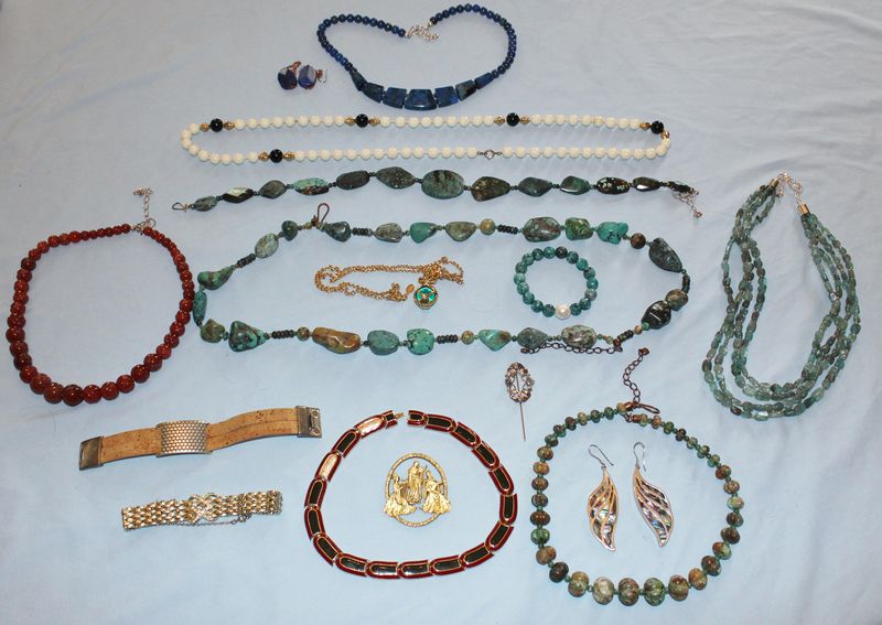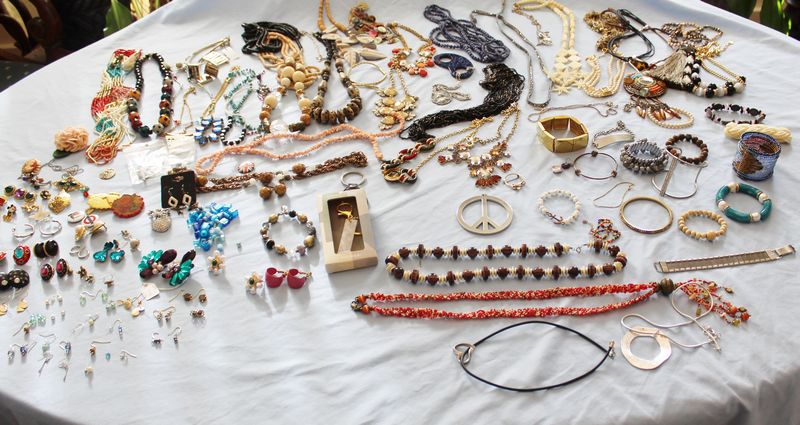 Costume jewelry necklaces, bracelets, pins, earrings, etc.
