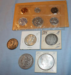 U.S. Silver coins including an 1882 S Morgan Silver Dollar; an 1892 Morgan Silver Dollar; a 1905 half dollar; a 1963 half dollar; a 1945 half dollar and a 1962 U.S. Mint Proof Coin Set with silver half dollar, quarter and dime. Shipping is available for this item.