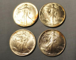 Four Walking Liberty 1 oz Fine Silver One Dollar coins including 1987, 1988, 1989 and 1990. Shipping is available for this item.