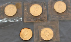 Five Canadian silver 5 dollar coins, each 1 ounce of .9999 silver including three 1988, a 1989 and a 1990. Four are sealed in packaging and appear to be uncirculated. Shipping is available for this item.