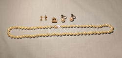 Gold jewelry including a 14k (stamped) yellow gold purse pendant .75 inches wide and weighing 1.14 grams; a pair of small diamond earrings mounted in 14k (stamped - earring backs are also gold) yellow gold and weighing .72 grams; a pair of 9mm pearl earrings mounted in 14k (stamped) white gold and weighing 2.92 grams; a 65 count 18"L cultured pearl necklace with a 14k (stamped) yellow gold clasp.