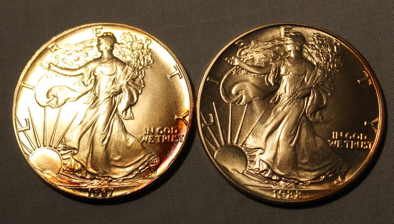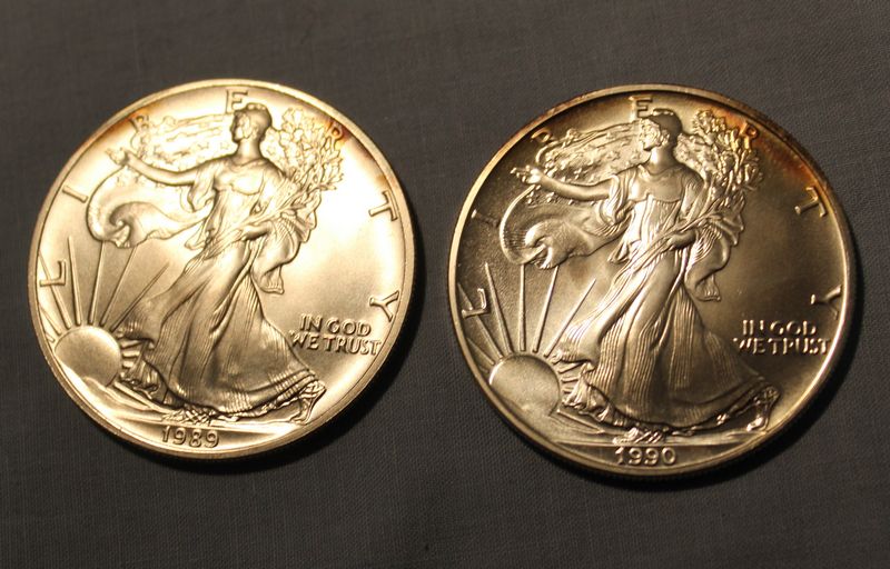 Four Walking Liberty 1 oz Fine Silver One Dollar coins including 1987, 1988, 1989 and 1990. Shipping is available for this item.