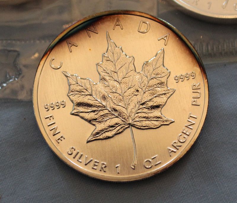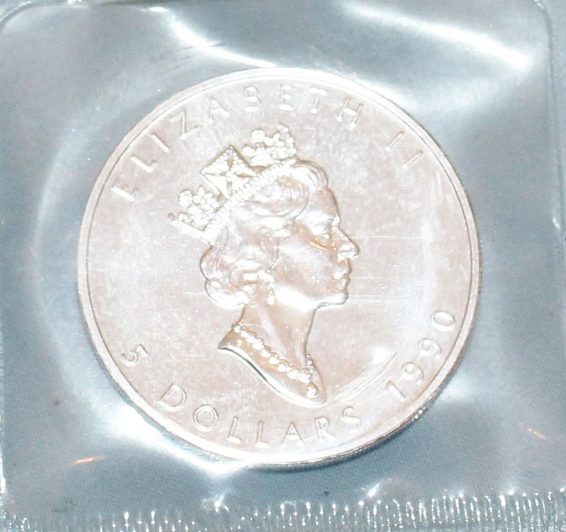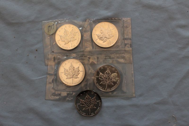 Five Canadian silver 5 dollar coins, each 1 ounce of .9999 silver including three 1988, a 1989 and a 1990. Four are sealed in packaging and appear to be uncirculated. Shipping is available for this item.