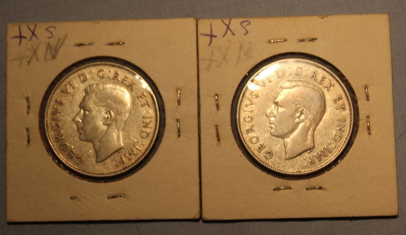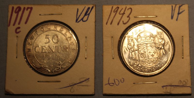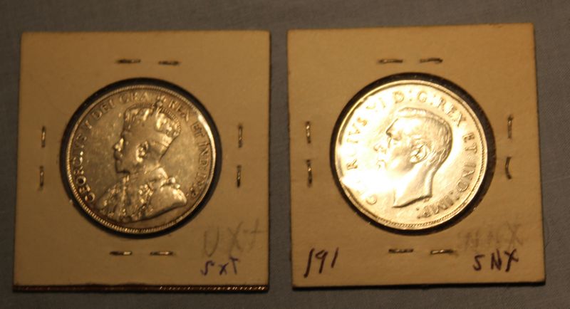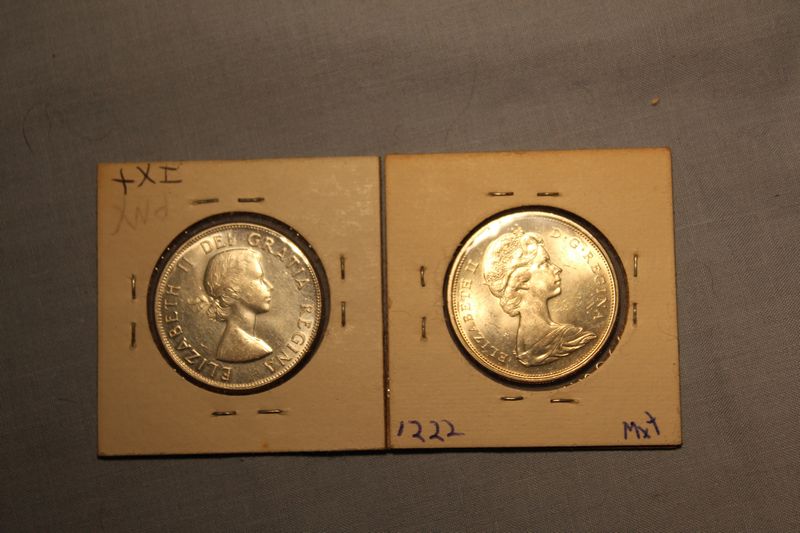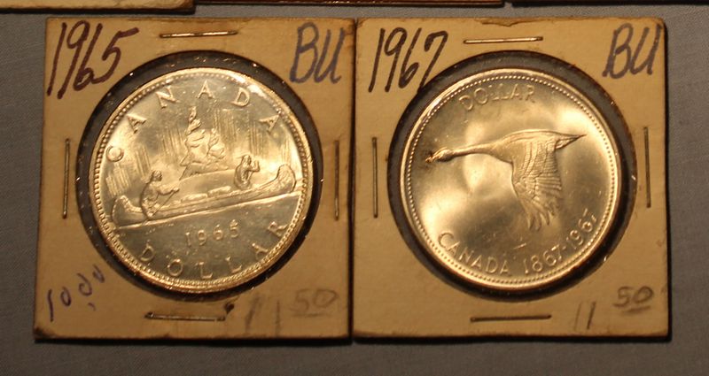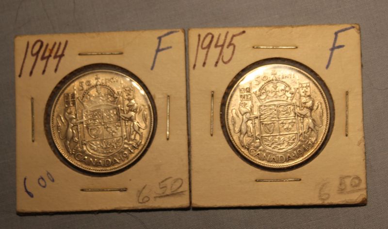 Silver Canadian coins including six 50 cent pieces (1917, 1943, 1944, 1945, 1958 & 1967) and 2 silver dollars (1965 & 1967). Shipping is available for this item.