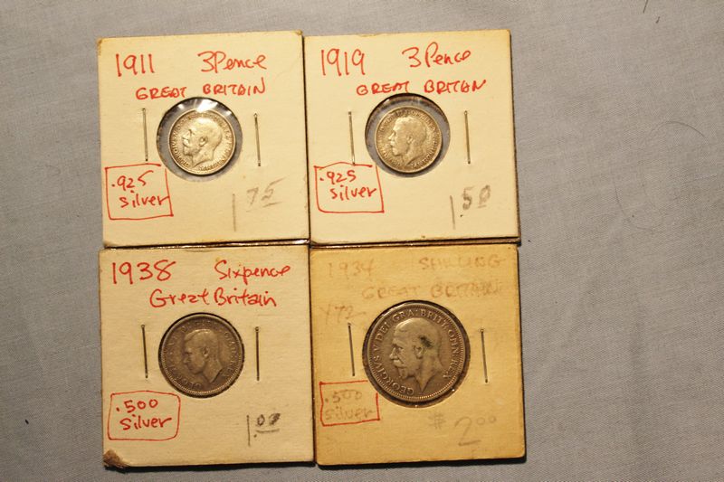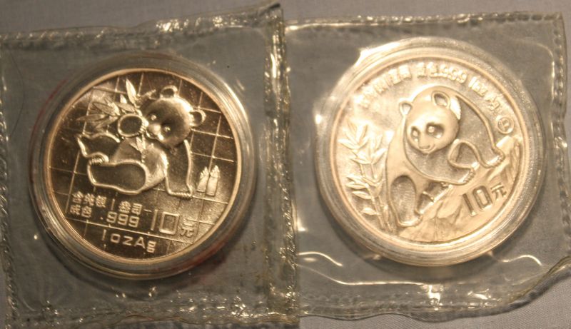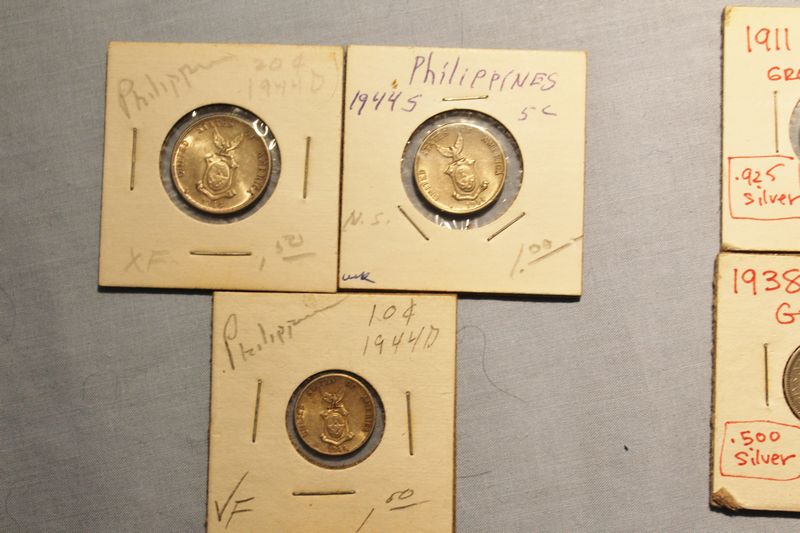 Foreign coins including a 1989 Australia Koala 1 Troy Ounce .999 Silver Dollar; a 1989 China 1 Ounce .999 Silver 10 Yuan; a 1990 China 1 Ounce .999 Silver 10 Yuan; a 1934 English silver shilling; three English 3 pence coins (1911, 1919 & 1938); a Phillippines 1944d 20 centavos coin; a Phillippines 1944d 10 centavos coin and a Phillippines 1944s 5 centavos coin.