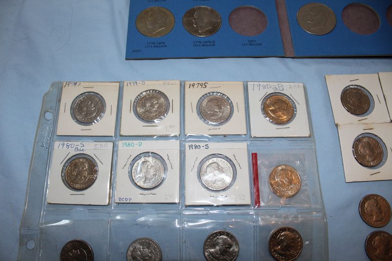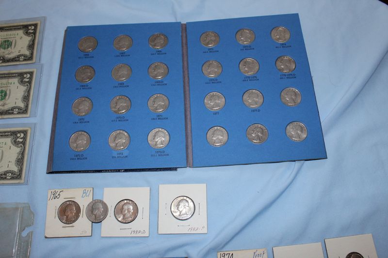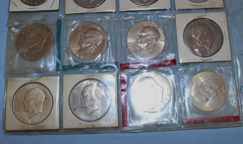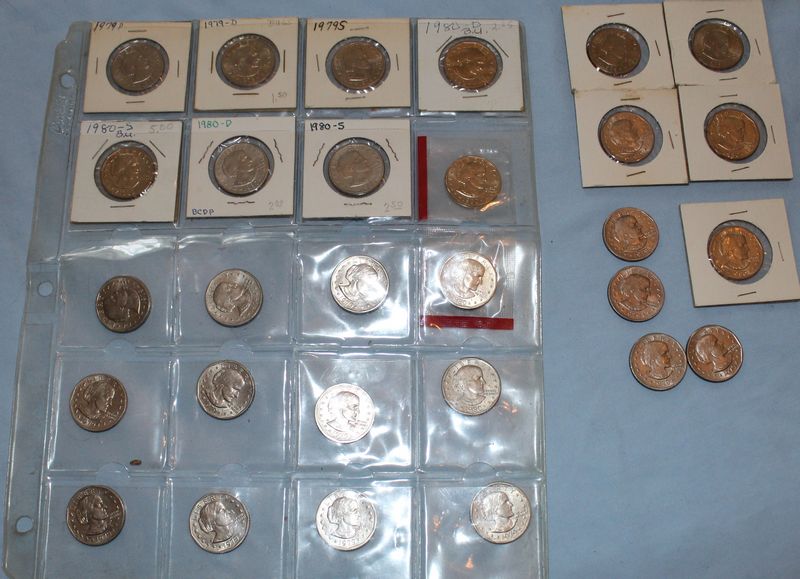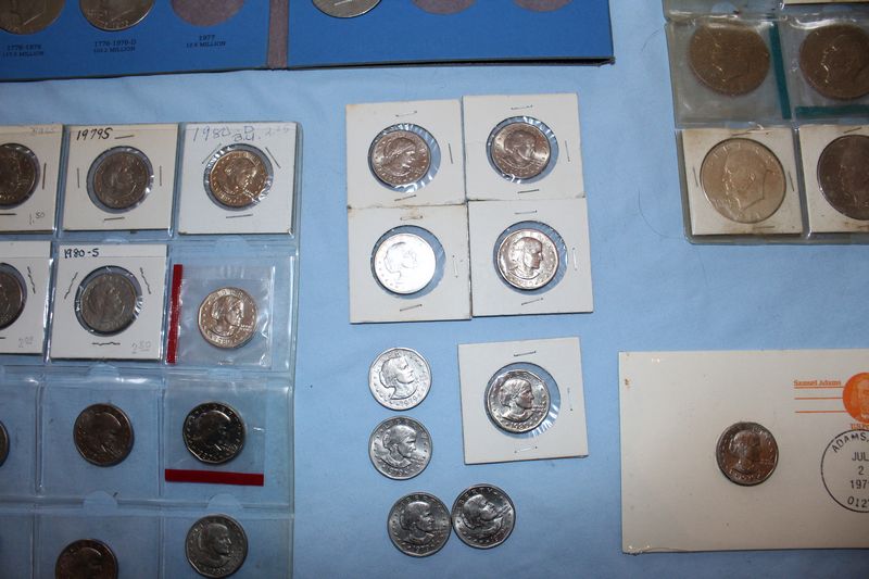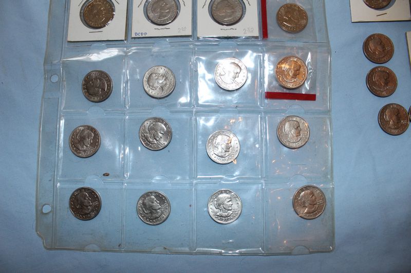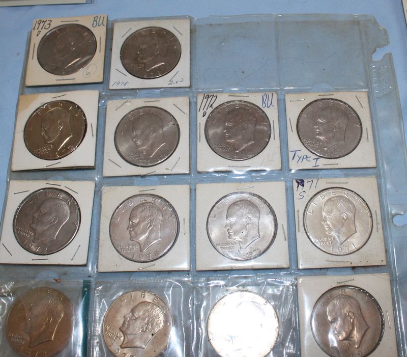 U.S. coins (all dated 1965 or later) and currency. Coins include 28 Eisenhower dollars; 30 Susan B. Anthony dollars; 28 Washington quarters; 22 Roosevelt dimes. Currency includes a 1935 G $1 Silver Certificate; a Series 1957 A $1 Silver Certificate; three Series 1957 $1 Silver Certificates; 4 Series 1976 $2 bills.