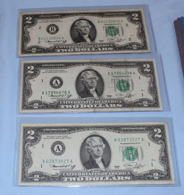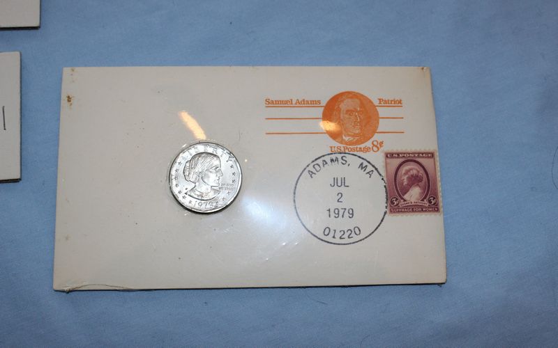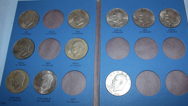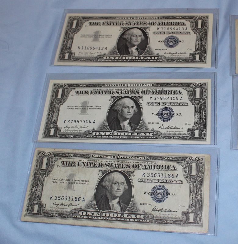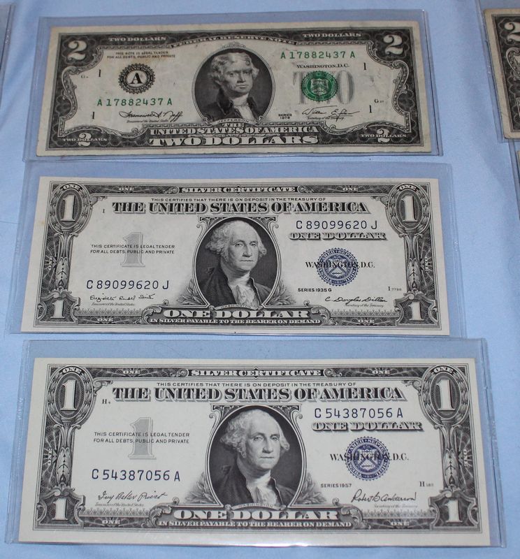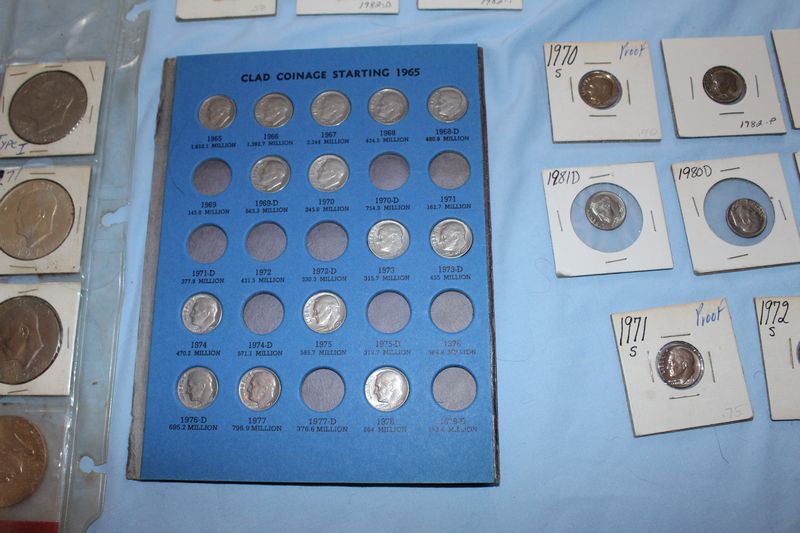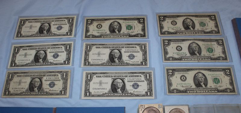 U.S. coins (all dated 1965 or later) and currency. Coins include 28 Eisenhower dollars; 30 Susan B. Anthony dollars; 28 Washington quarters; 22 Roosevelt dimes. Currency includes a 1935 G $1 Silver Certificate; a Series 1957 A $1 Silver Certificate; three Series 1957 $1 Silver Certificates; 4 Series 1976 $2 bills.