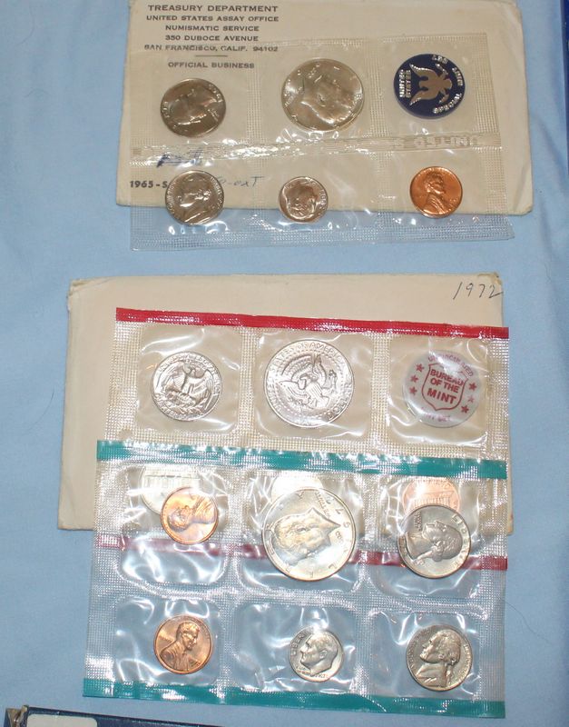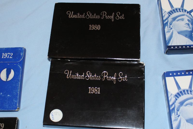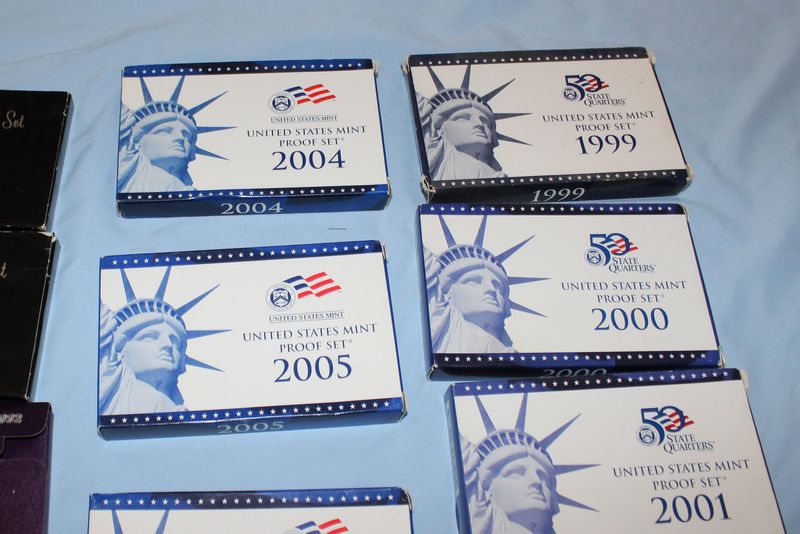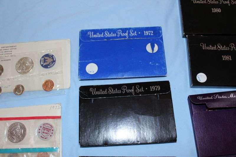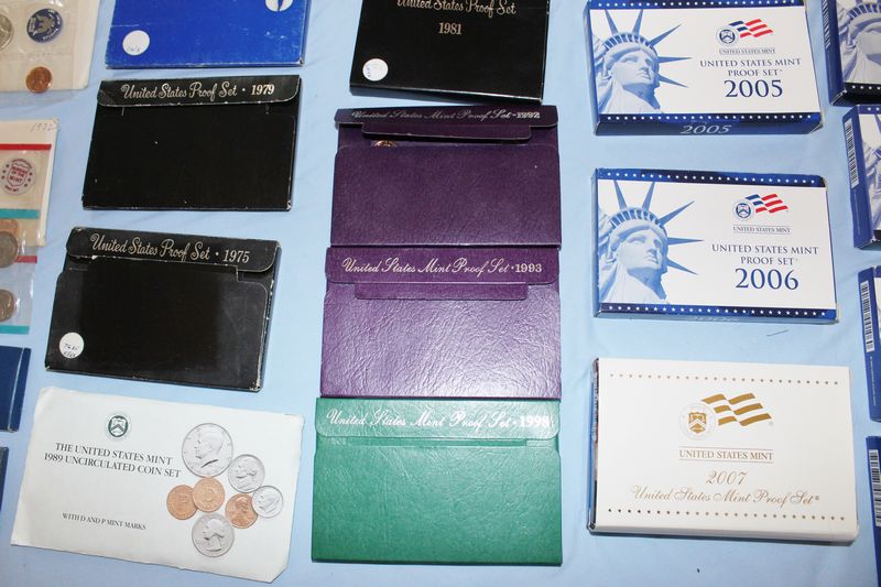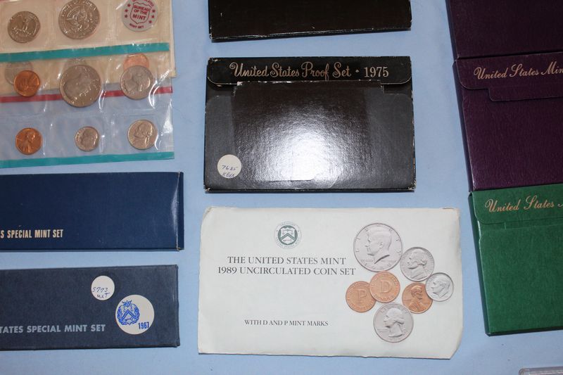 U.S. Mint coin sets including a 1965 Special Mint set; 1972 Mint Set; 1966 and 1967 Special Mint Sets; United States Proof sets from 1972, 1979, 1975, 1980, 1981, 1992, 1993, 1998, 2004, 2005, 2006, 2007; an Uncirculated Coin Set with D and P mint marks from 1989; 50 State Quarters Mint Proof Sets from 1999, 2000, 2001, 2002, 2003. Also with this lot are sets of coins from 1974 and 1980 in clear plastic containers.