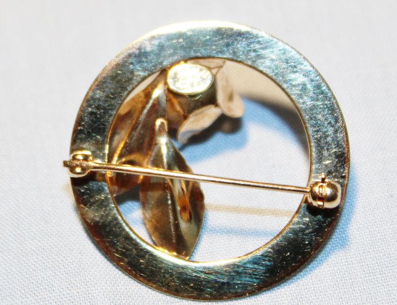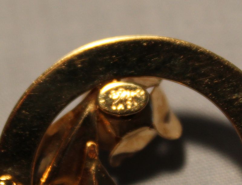 14k yellow gold (stamped) pin with small pink sapphire 1.25"W and weighing 4.88 grams. Shipping is available for this item.