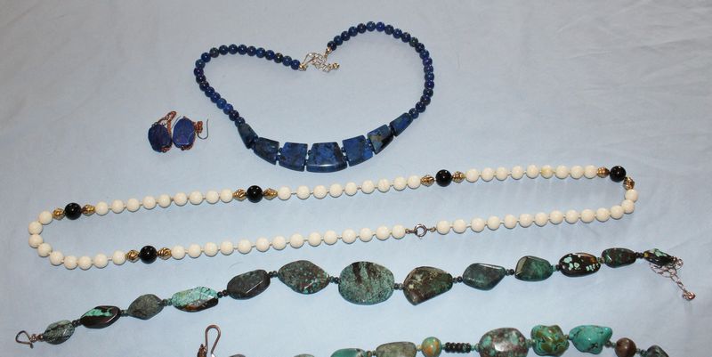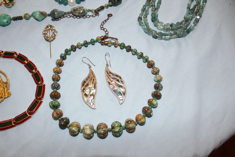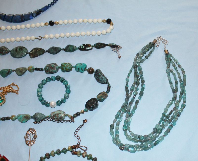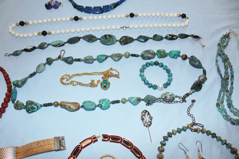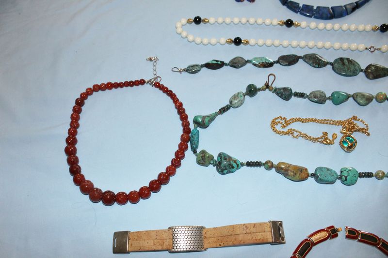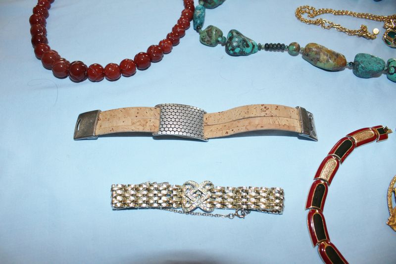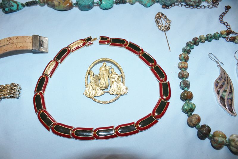 Quality jewelry including a vintage Coro linked bracelet with rhinestones; a Lanvin, Paris brass choker with red and green enamel; a Museum of Fine Arts brass brooch with women playing musical instruments; turquoise necklaces and bracelet; Joan Rivers pendant necklace; onyx and white coral necklace; red coraline necklace; Lapis necklace and earrings.