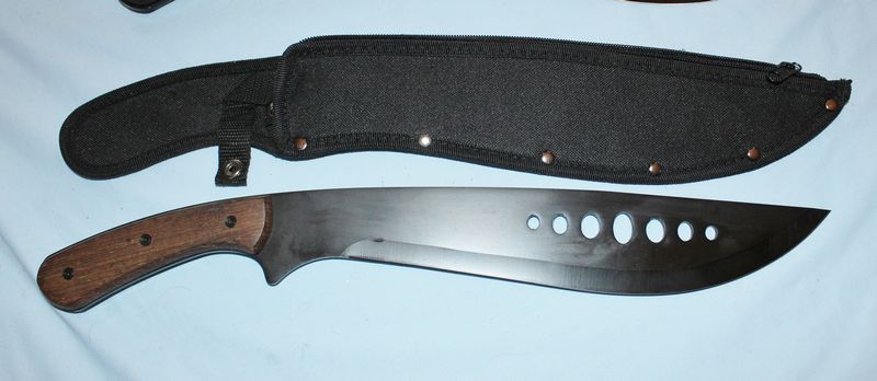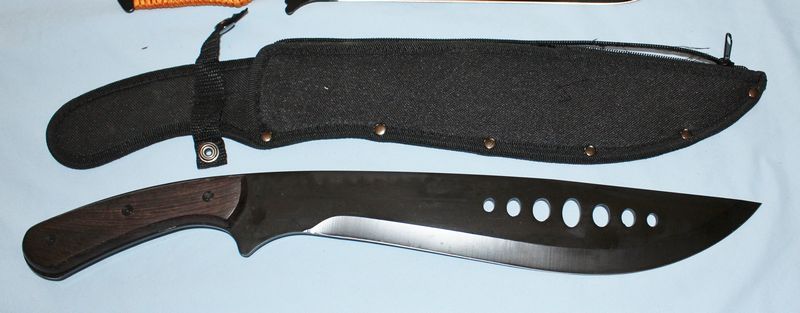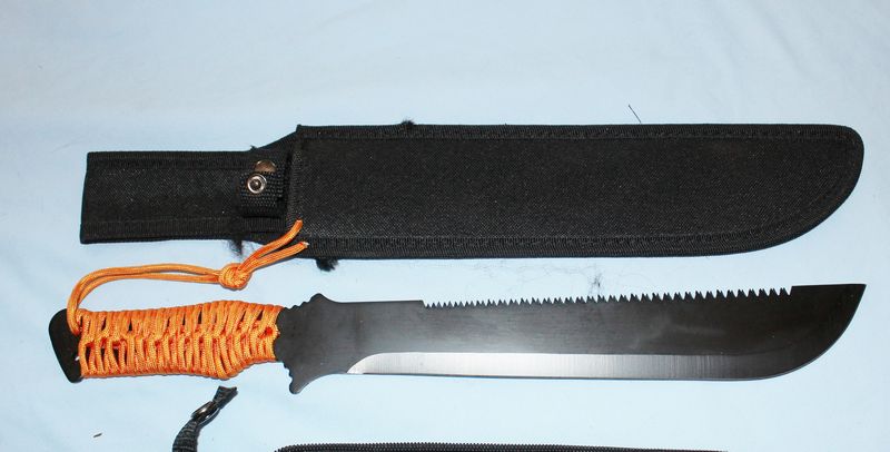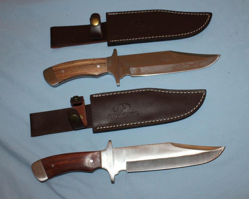 Sheath knives and axes, most unbranded. Two appear to be custom made. The two Bowie knives may be Mossy Oak. Longest knife is 17.5"L.