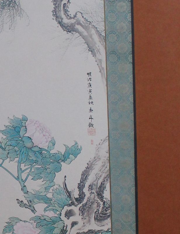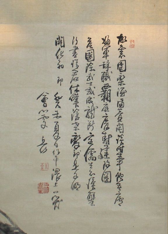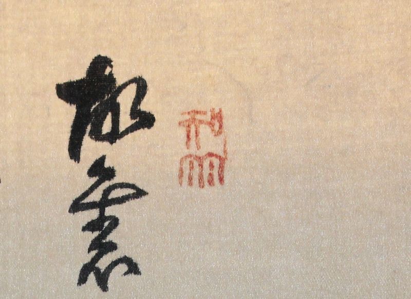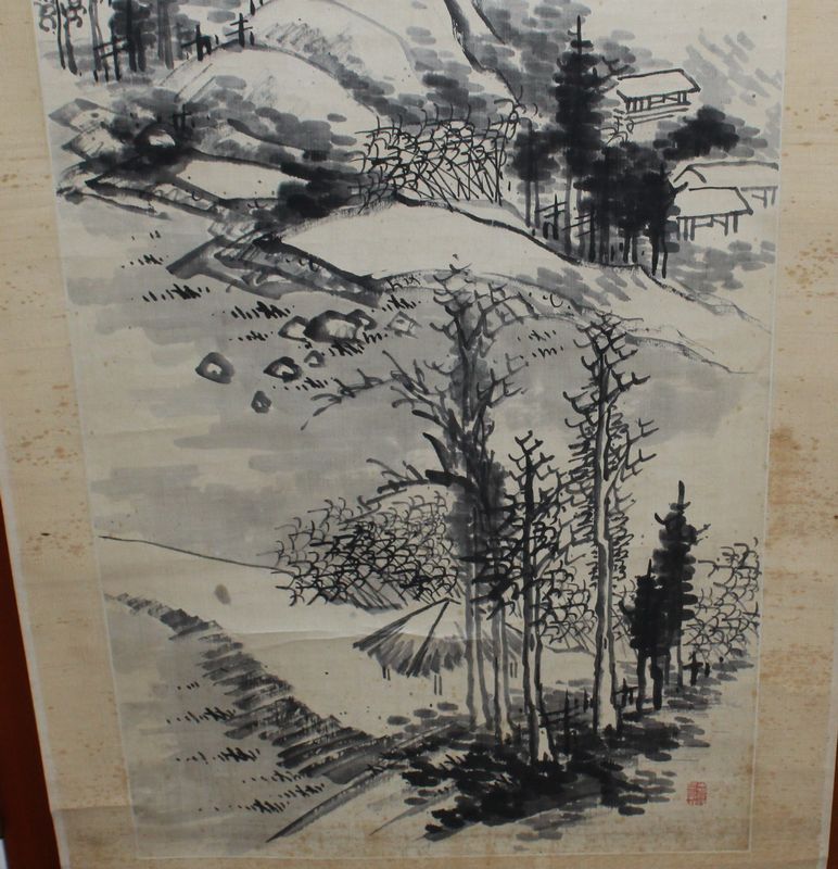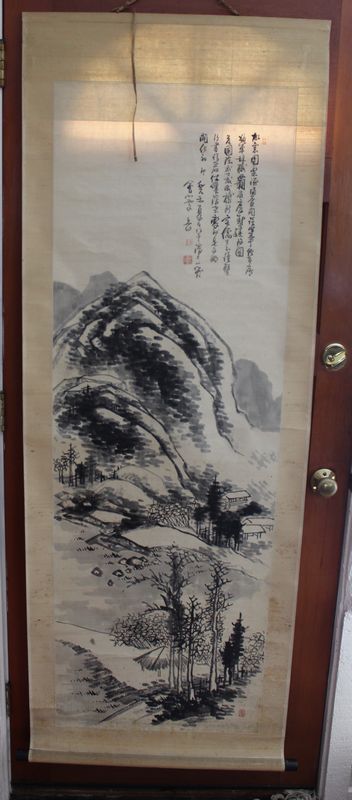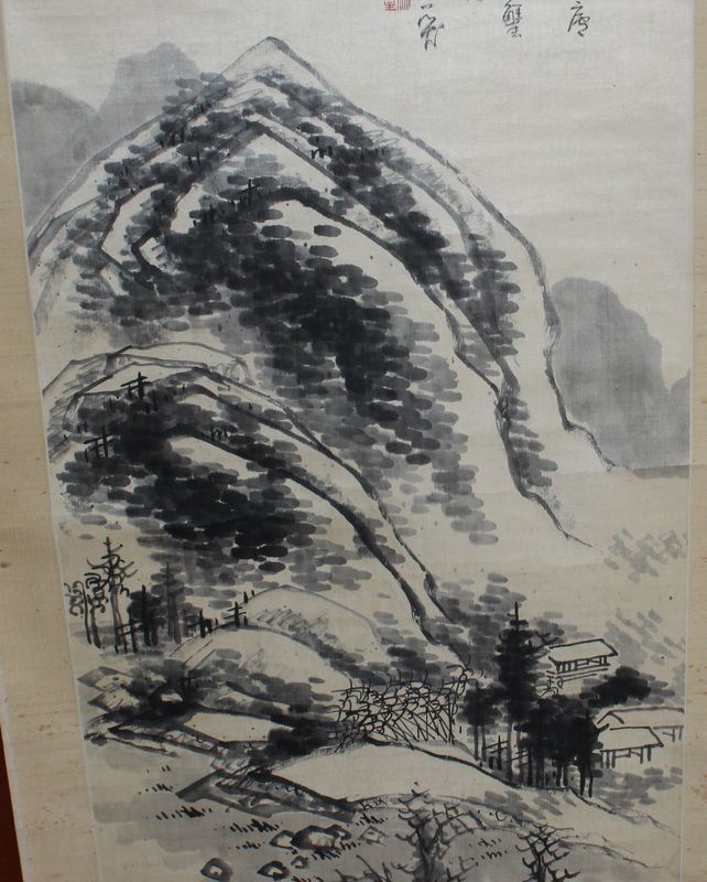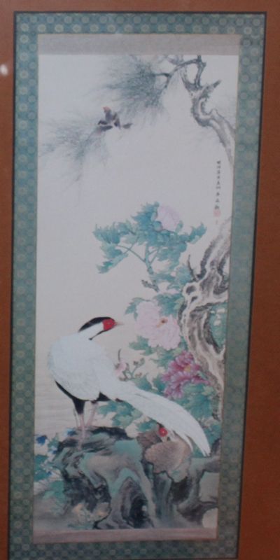 Two framed Asian prints including Hibo Kannon (Motherly Compassion Kannon) originally created in 1888 by the Japanese artist Kano Hogai (1828–1888); and a print on silk featuring a pair of Manchurian cranes among flowering plants, presented in a hanging scroll format (kakemono-style) within a gold-toned frame and a rust-colored matting. Frames are 39"Tx21"W. Also with this lot is a hanging scroll featuring a traditional Asian landscape painting, likely in the Shan Shui (mountain-water) style and includes Chinese calligraphy and red artist's seals. The scroll is 70"Tx25"W.