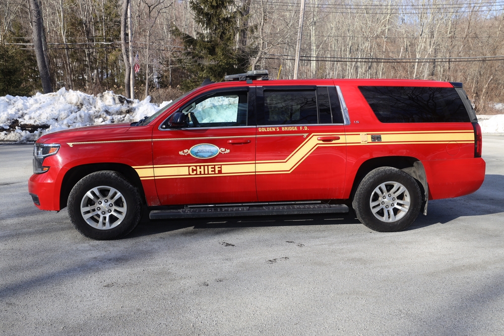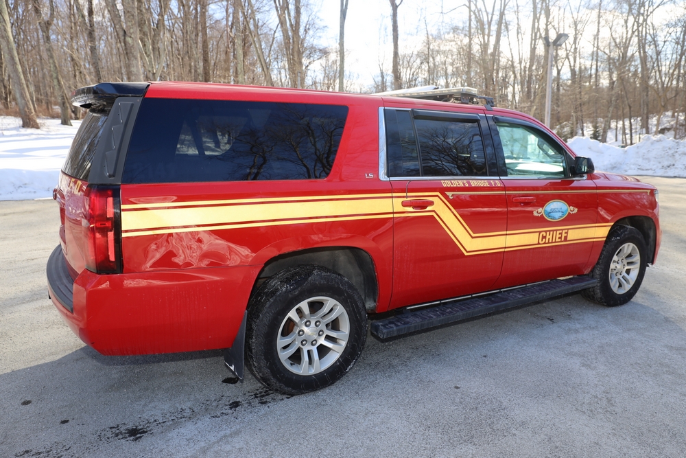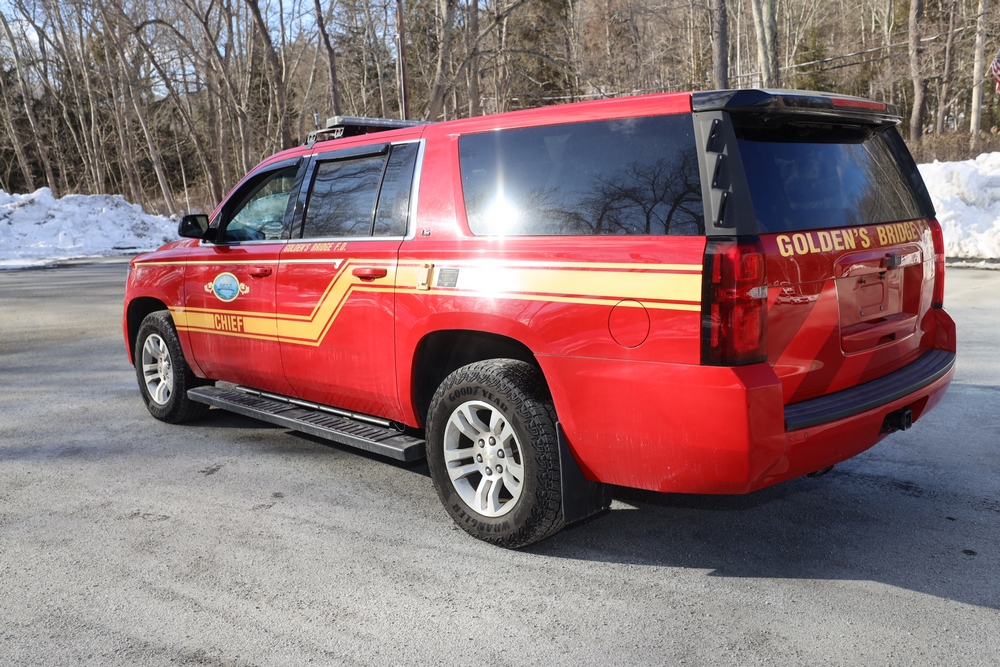 Items include 2016 Chevrolet Suburban 4WD SUV; 2007 EZ Loader marine trailer; Matrix excercise bike; Matrix elliptical; Matrix leg/calf press; Jiffy ice drills/auger; Paratech Pakhammer; Hale gas powered fan; rolls of firehose; Gemtor harnesses & more. Items are located in Golden's Bridge, NY.