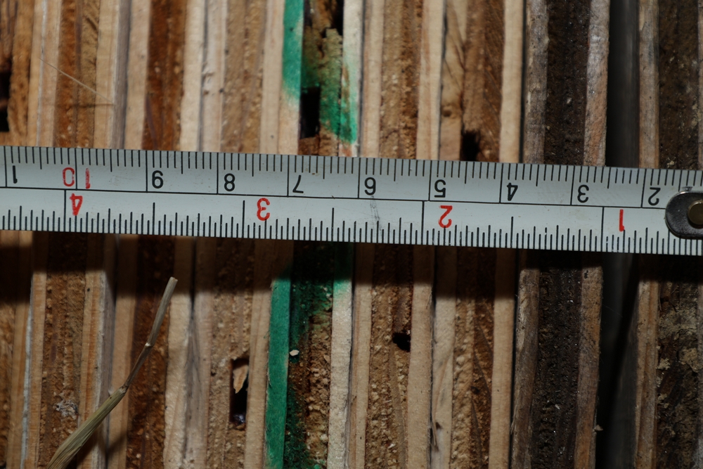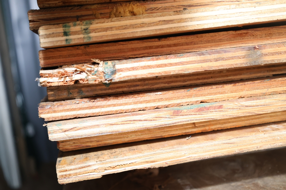 Assorted stacked plywood sheets of varying thicknesses and sizes, approximately 1/2 inch to 3/4 inch thick as shown by tape measure, including multiple full and partial sheets.
