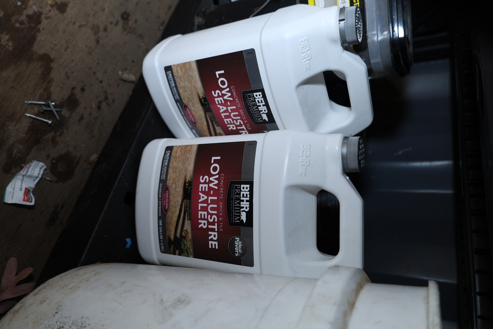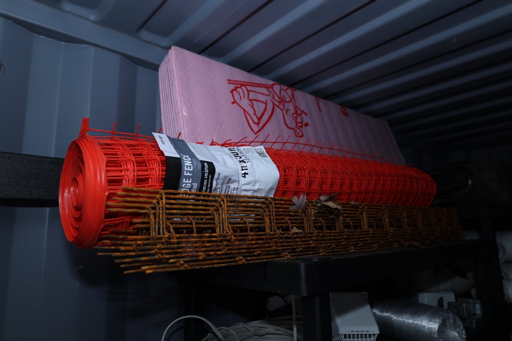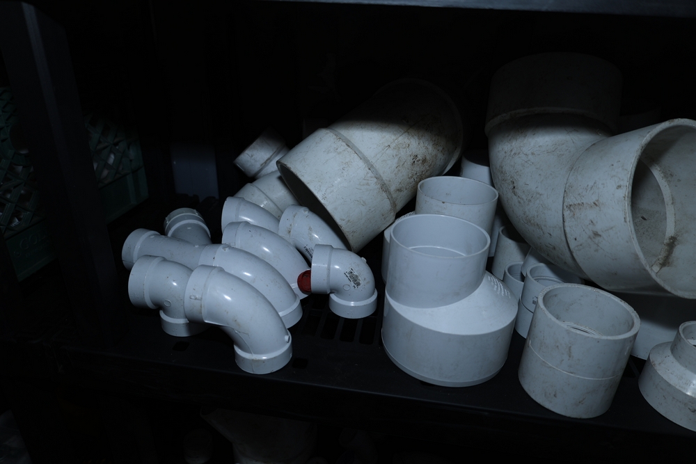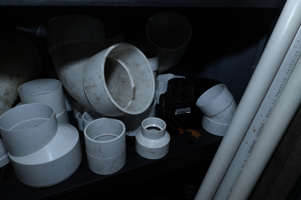 Contents of shelving unit including assorted PVC pipe fittings and elbows in multiple sizes, white PVC pipe sections, rolls of red and blue PEX tubing, roll of orange plastic safety fence, pink rigid foam insulation boards, welded wire mesh panels, Husky contractor clean up bags box, Grip Rite construction screws, Teks self drilling screws, assorted nails and fasteners in containers, Miracle Gro Shake n Feed plant food, Ortho weed and grass killer, additional lawn and garden chemicals in plastic jugs, paint cans, and miscellaneous hardware and plumbing supplies. Excludes other lots. Buyer must take all.