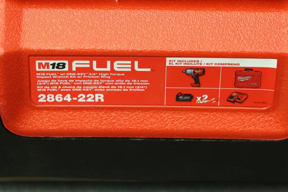 Milwaukee 2864-22R M18 Fuel One-Key Compatibility High Torque Impact Wrench with 3/4 Inch Friction Ring Kit. Includes the M18 Fuel impact wrench, charger, two RedLithium XC 5.0 batteries, and carrying case. Features 1500 ft-lbs of torque, One-Key technology for tool customization and tracking, and a compact design. The carrying case has a crack visible in the exterior. Pickup only.
