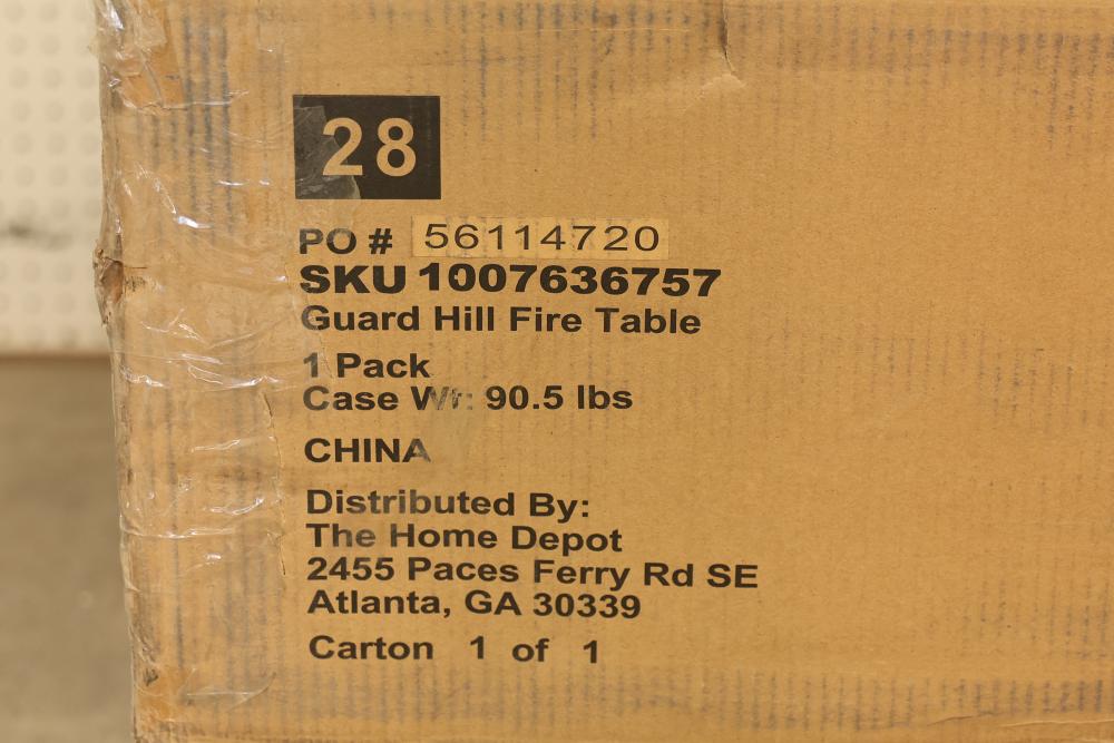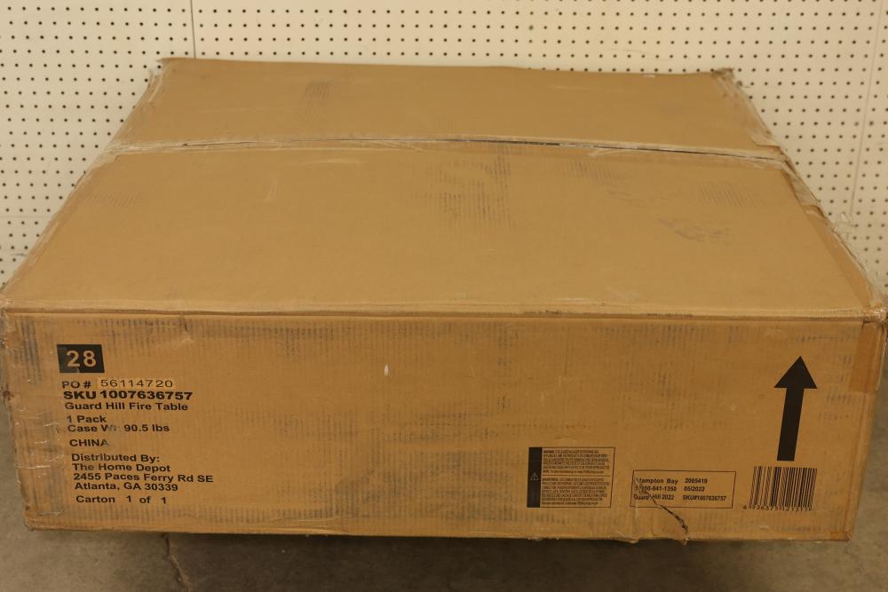 Hampton Bay FP21531-J 36 Inch Wide 50,000 BTU Guard Hill LP Gas Fire Table. Features a sturdy metal construction, black finish, and includes all necessary components for setup. New in original packaging. Manufactured by Hampton Bay and distributed by The Home Depot. Item weights 90.5 lbs. Pickup only.