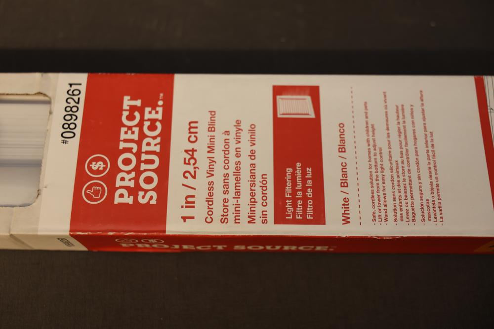 Project Source 0898261 Cordless Vinyl Mini Blind, 58 in x 64 in, White. Designed for light filtering, this blind comes with a cordless feature for safety and convenience. There are two packages in total. Dimensions are 58 inches wide and 64 inches long, with an actual width of 57.5 inches. Pickup only.