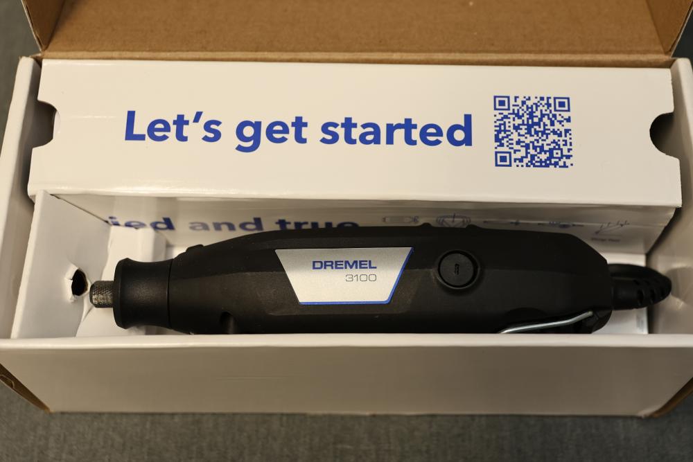 Dremel 3100-1/15 Corded 1.2 Amp Variable Speed Rotary Tool Kit features a 1.2-amp motor providing variable speed operation from 5,000 to 35,000 RPM. Kit includes 16 accessories for engraving, cutting, sanding, grinding, polishing, and more. The collet accommodates 1/32 to 1/8 inch bits, and it comes with a 6-foot cord. Includes instruction manual and storage case. Pickup only.