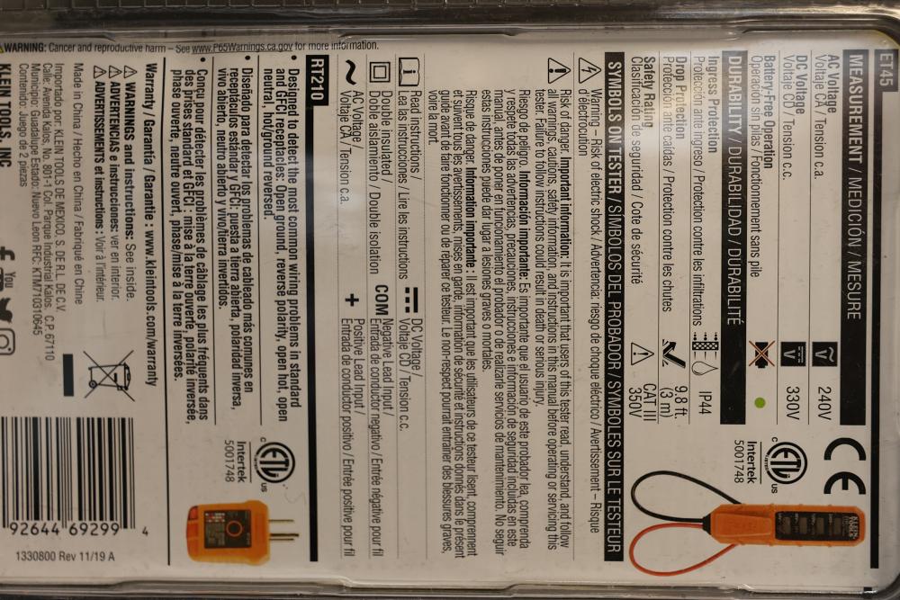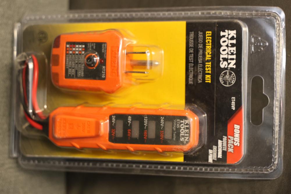 Klein Tools ET45VP Electrical Test Kit and Tempo Communications PM100 Pocket Automatic Digital Multimeter. The ET45VP kit measures AC voltage up to 240V and includes a receptacle tester for diagnostic purposes, featuring durable construction. The PM100 Pocket Automatic Digital Multimeter from Tempo Communications measures AC/DC voltage up to 300V, includes automatic and manual mode selection, and features a pocket-sized design with a large clear display. Both items are in their original packaging and appear unused. Pickup only.